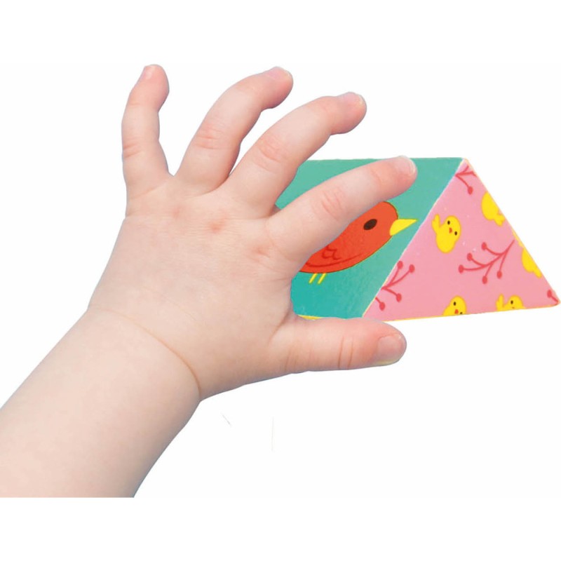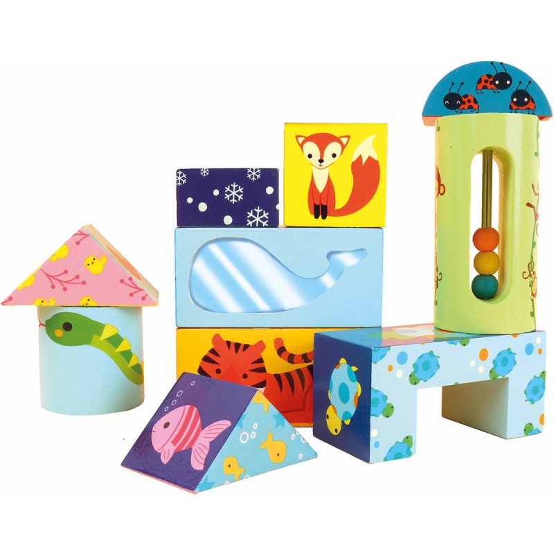 14 cubes en bois dont 6 cubes sensoriels à monter, assembler, empiler... Eléments sensoriels : 4 cubes sonores à agiter, 1 miroir, 1 boulier de 3 billes