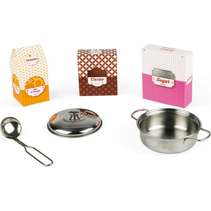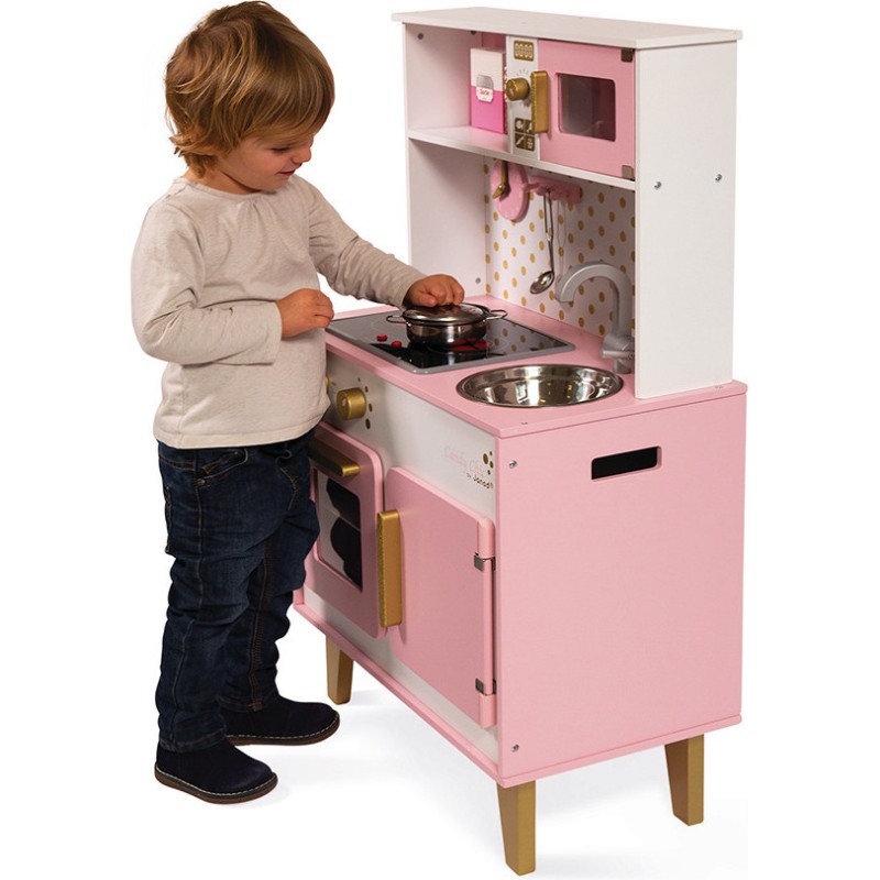 Les cuisinières pour enfants sont donc des jeux complets et très riches ! Cette cuisine en bois rose et doré va faire voyager les enfants à partir de 3 ans aux pays des saveurs sucrées et délicates. Elle est parfaitement équipée et les petits pourront s'imaginer dans une véritable cuisine grâce à ses nombreux accessoires : une patère servant à suspendre la louche en métal, une casserole et un couvercle en métal et trois boites d'aliments en carton (jus d’orange, cacao, sucre).