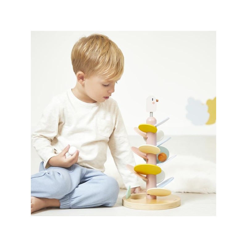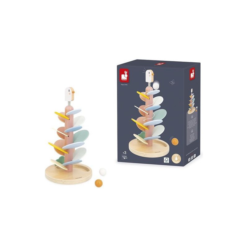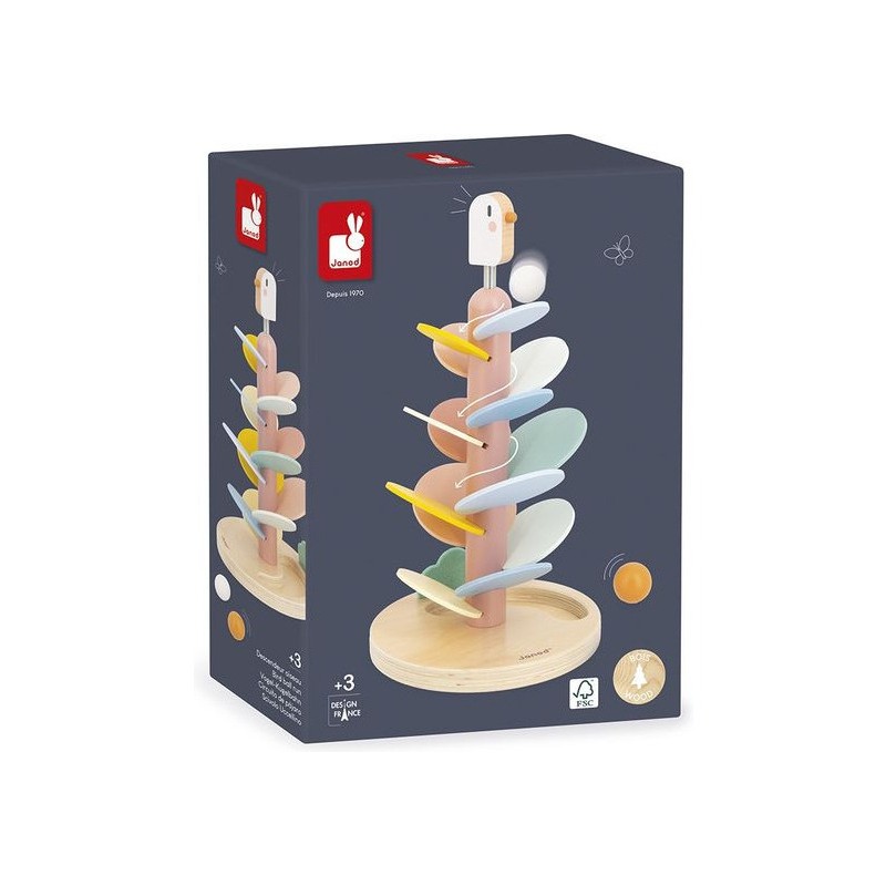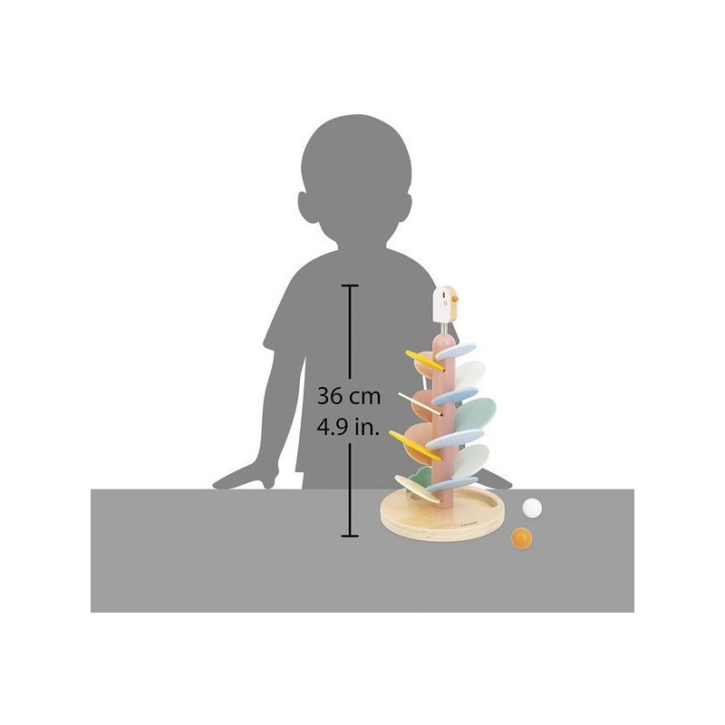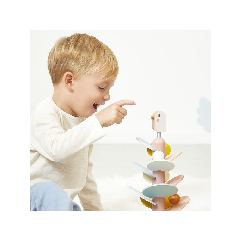 Un maxi descendeur à croquer ! Idéal pour les enfants dès l’âge de 3 ans, cet adorable descendeur oiseau est à la fois un jeu de construction et un jeu sonore tout doux. Il a été pensé pour développer la motricité fine des enfants et leur compréhension du rapport de cause à effet. Pour commencer, la base sera assemblée par un adulte : il s’agit du tronc de l’arbre, sur lequel un oiseau à ressort niche gentiment. Ensuite, les petits se munissent de la carte modèle incluse pour encastrer les feuilles de l’arbre. Elles sont au nombre de 14 et de différentes couleurs et tailles. Une fois le bel arbre assemblé, vient le moment tant attendu de la descente ! 2 billes en bois sont incluses avec le jouet : faites-les dévaler les feuilles pour découvrir une cascade de sons doux et répétitifs. L’une après l’autre, ou les deux en même temps, les balles sont si satisfaisantes à observer lors de la descente ! À l’arrivée, elles finissent leur course dans l’encoche prévue pour les accueillir dans le pied du support. Voilà un jeu éducatif, poétique et plein de douceur ! Les couleurs tendres, la feutrine et le bois naturel donnent beaucoup de charme à ce descendeur de 36 cm de haut. Avec son diamètre de 19,3 cm, c’est un bel objet déco pour une chambre d’enfant. Issu de notre collection Sweet Cocoon, ce grand descendeur est composé de bois issu de forêts gérées durablement, certifié Fsc™. Alors, lancez-vous !