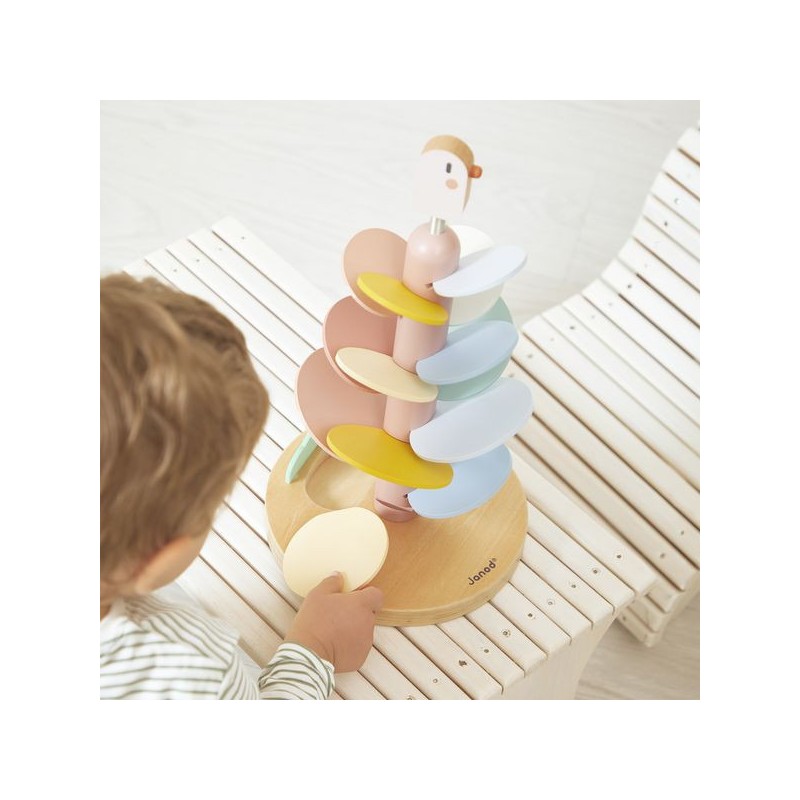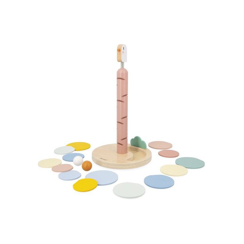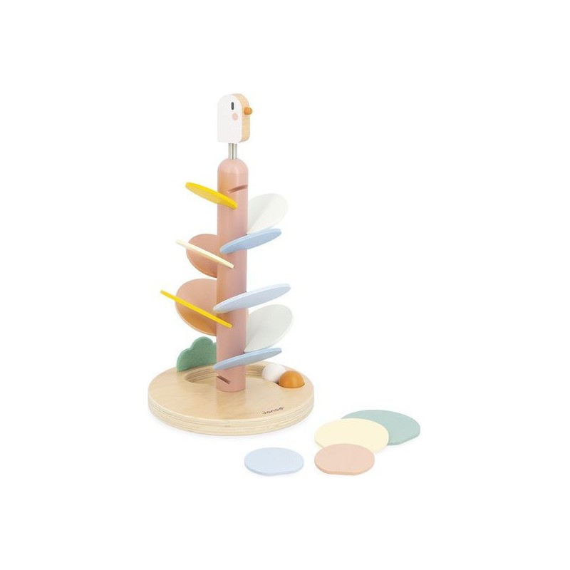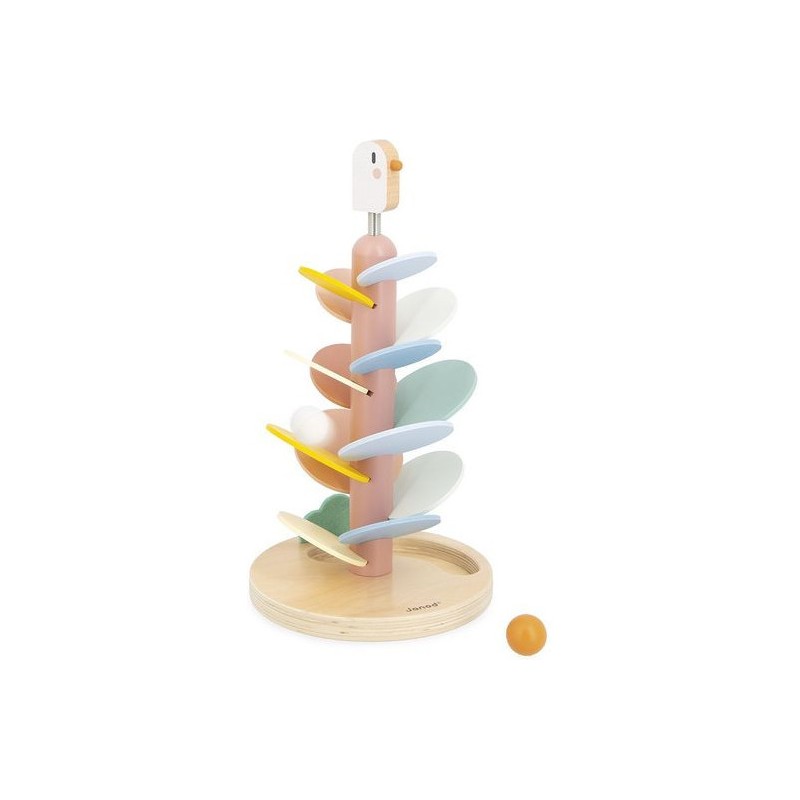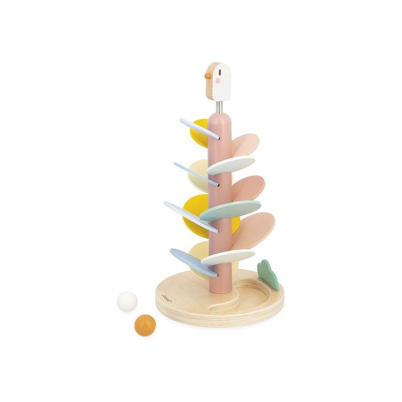 Un maxi descendeur à croquer ! Idéal pour les enfants dès l’âge de 3 ans, cet adorable descendeur oiseau est à la fois un jeu de construction et un jeu sonore tout doux. Il a été pensé pour développer la motricité fine des enfants et leur compréhension du rapport de cause à effet. Pour commencer, la base sera assemblée par un adulte : il s’agit du tronc de l’arbre, sur lequel un oiseau à ressort niche gentiment. Ensuite, les petits se munissent de la carte modèle incluse pour encastrer les feuilles de l’arbre. Elles sont au nombre de 14 et de différentes couleurs et tailles. Une fois le bel arbre assemblé, vient le moment tant attendu de la descente ! 2 billes en bois sont incluses avec le jouet : faites-les dévaler les feuilles pour découvrir une cascade de sons doux et répétitifs. L’une après l’autre, ou les deux en même temps, les balles sont si satisfaisantes à observer lors de la descente ! À l’arrivée, elles finissent leur course dans l’encoche prévue pour les accueillir dans le pied du support. Voilà un jeu éducatif, poétique et plein de douceur ! Les couleurs tendres, la feutrine et le bois naturel donnent beaucoup de charme à ce descendeur de 36 cm de haut. Avec son diamètre de 19,3 cm, c’est un bel objet déco pour une chambre d’enfant. Issu de notre collection Sweet Cocoon, ce grand descendeur est composé de bois issu de forêts gérées durablement, certifié Fsc™. Alors, lancez-vous !