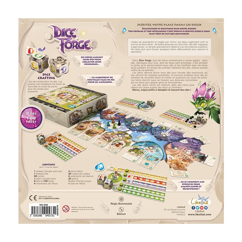 Forgez le monde, forgez vos dés ! Héros, soyez prêts ! Les Dieux offrent une place à leurs côtés à celui qui triomphera de ses concurrents. Votre courage et votre astuce seront vos meilleurs alliés, grâce aux dés offerts par les Dieux, récoltez les ressources qui vous assureront la victoire ! Vos dés divins sont exceptionnels : leurs faces sont amovibles ! Personnalisez vos dés en cours de partie pour devenir plus puissants. Améliorez votre dé pour récolter les ressources dont vous avez besoin. Mesurez-vous aux épreuves concoctées par les dieux pour augmenter votre gloire et gagner des récompenses. Dice Forge est un jeu de développement doté d’un matériel innovant : des dés aux faces amovibles. Dans ce jeu de dice crafting vous construisez vous-même votre dé. Lancez vos dés, gérez vos ressources, réalisez les épreuves avant vos adversaires et explorez les multiples stratégies pour remporter la victoire. Contenu