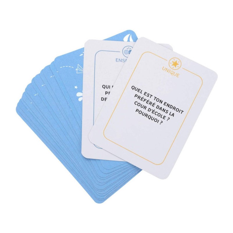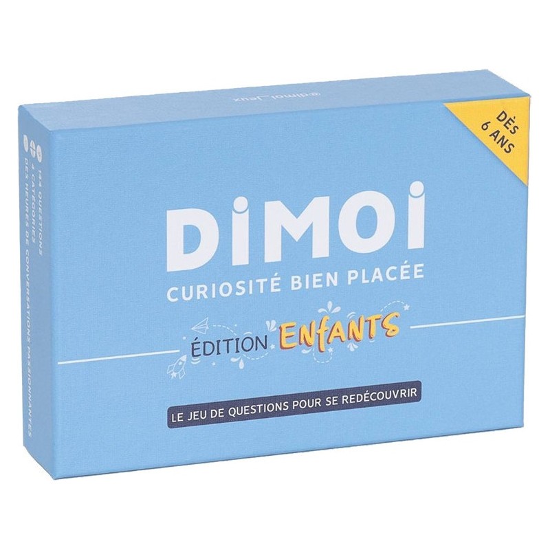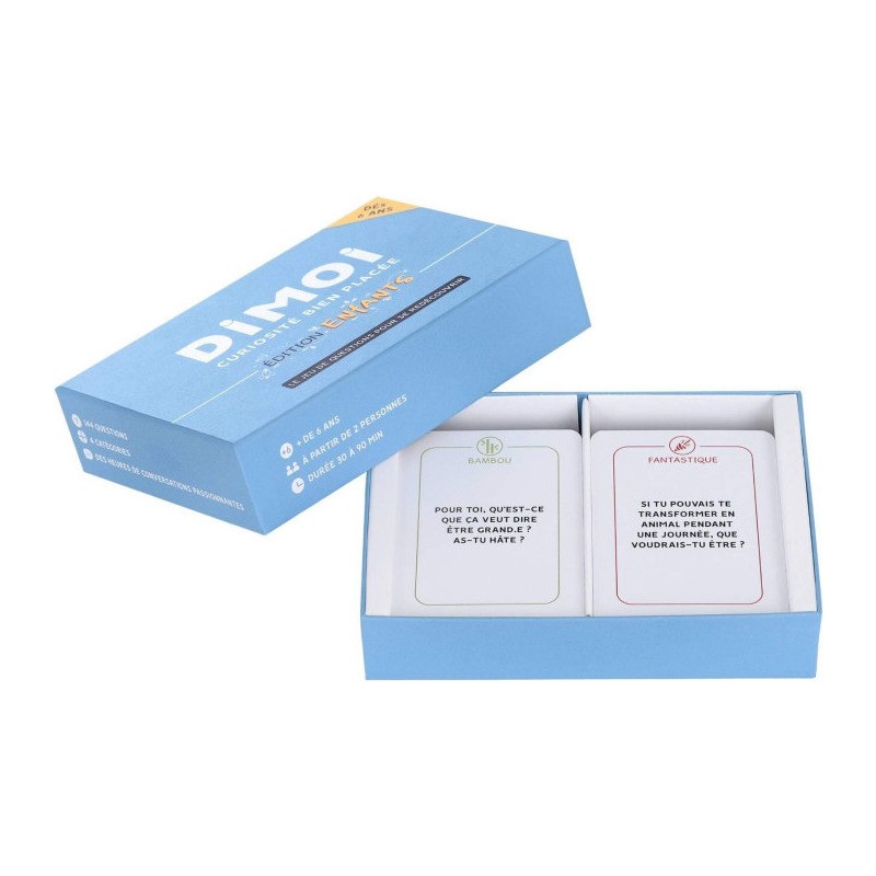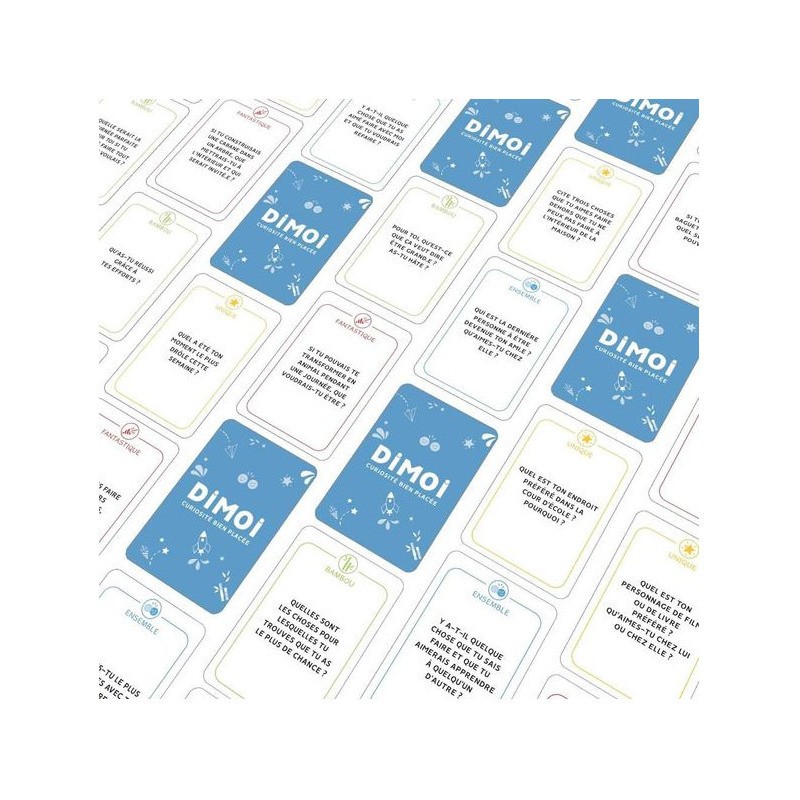 Notre jeu propose une manière ludique et inspirante de communiquer avec vos enfants sur des sujets variés et originaux. Le jeu est composé de 4 catégories : Ensemble, Fantastique, Unique et Bambou. Mélangez les cartes ou choisissez une catégorie selon votre humeur de jeu et celles de vos enfants ! Les parents tirent les cartes une à une et posent les questions aux enfants. De quelques cartes ou des heures de discussion ! Avec Dimoi : Partagez Un Moment PrivilÉGiÉ Avec Vos Enfants : vivez des moments de qualité remplis de rires, de réflexion, d'imagination et de prises de recul positives. Restez À L'ÉCoute : soyez les premiers à connaître les besoins de vos enfants, leurs émotions, leurs envies, leurs rêves et leurs inquiétudes. Un Jeu Pour Les Aider À Grandir Et À S'ÉPanouir : conçu en collaboration avec des experts en psychologie et en éducation, chaque question est là pour aider vos enfants à se développer, à s'interroger et vous permettre de les accompagner au mieux.