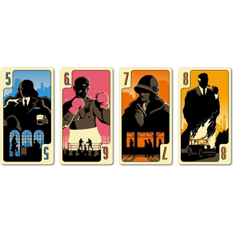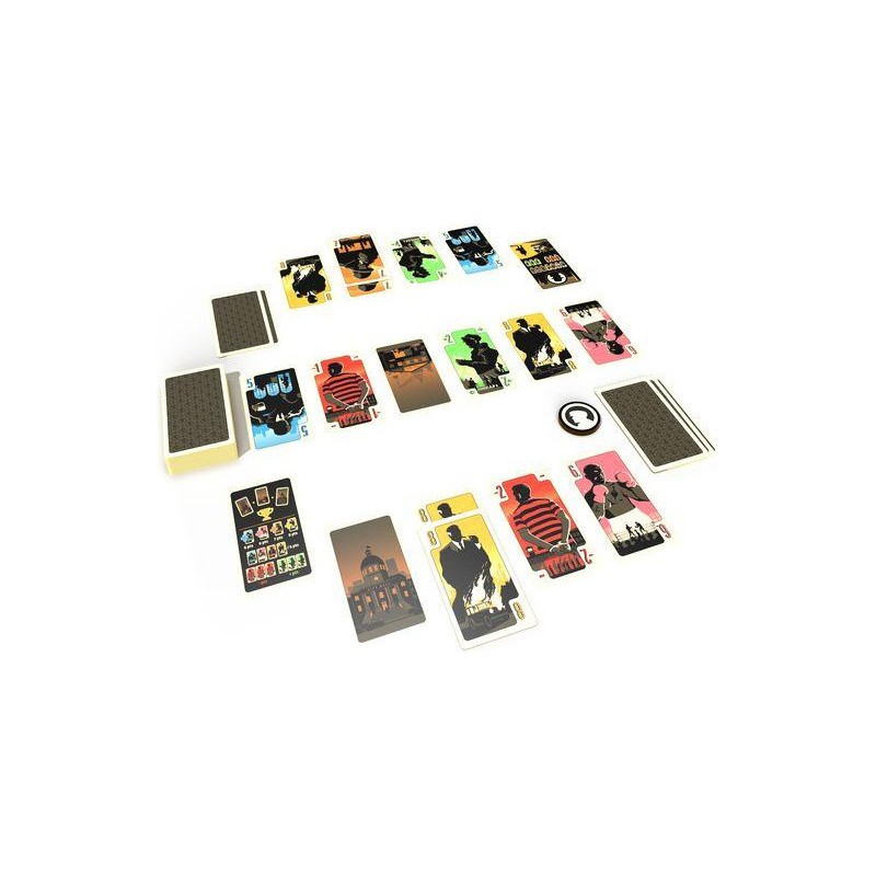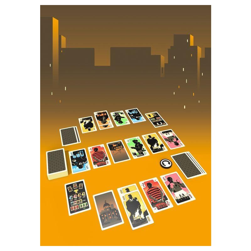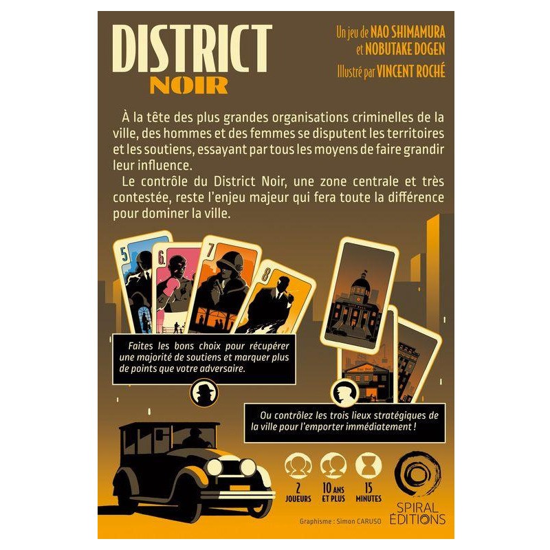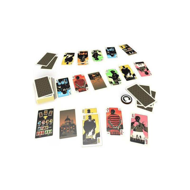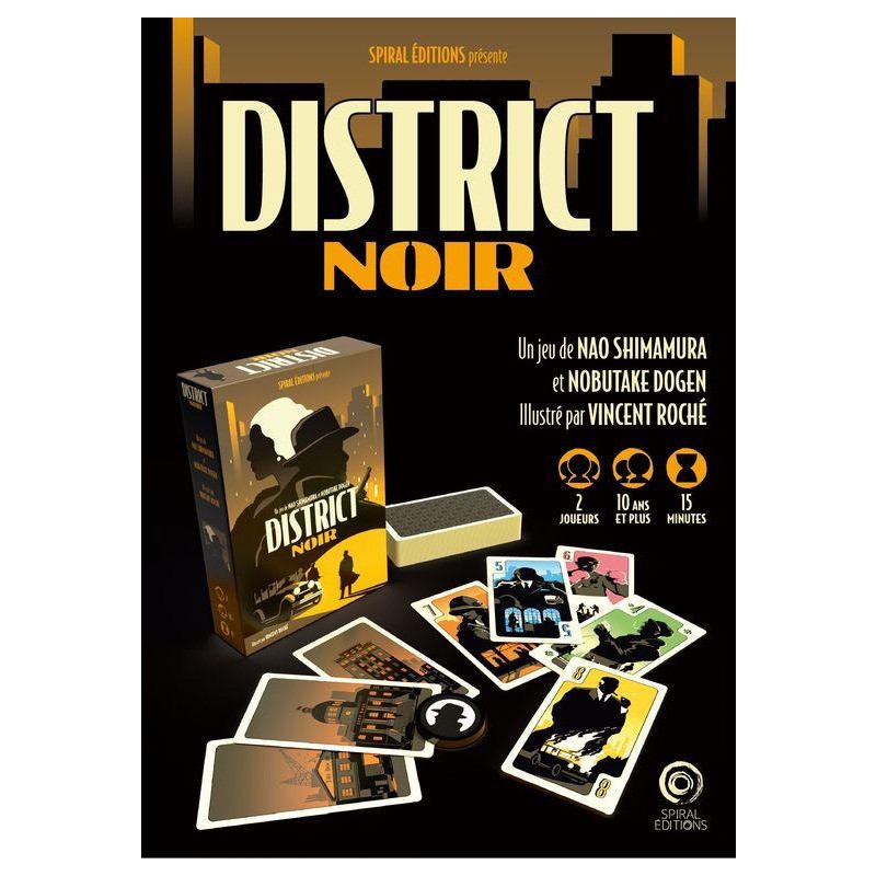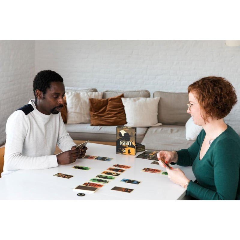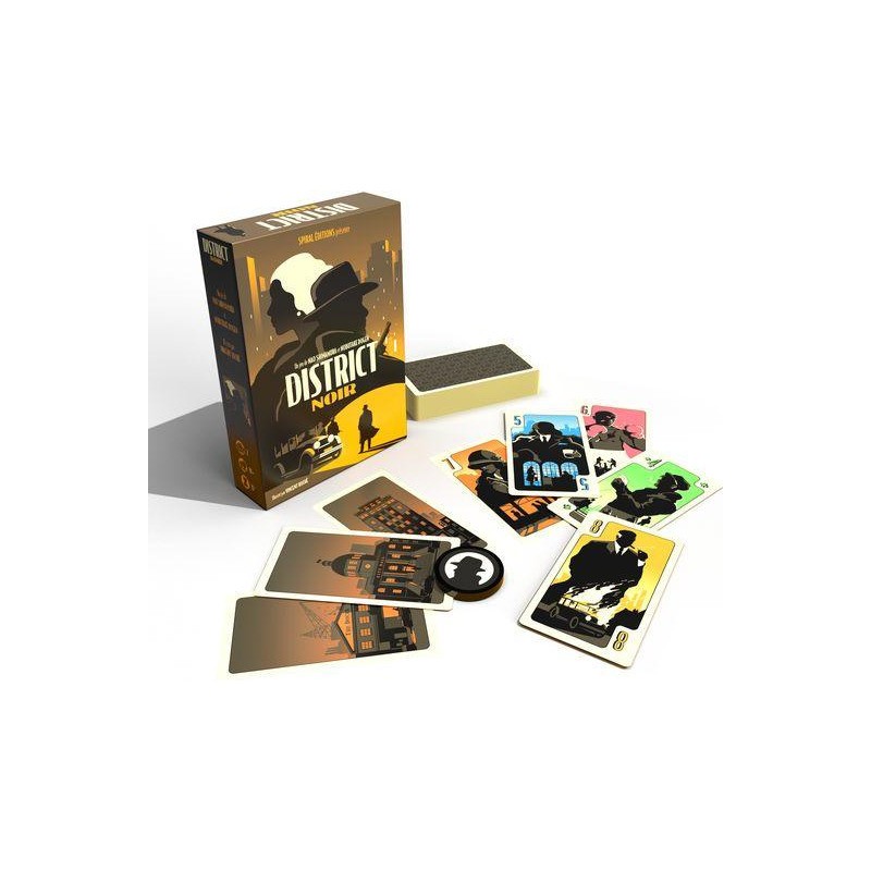 La ville est gangrénée par de grandes organisations criminelles qui s’affrontent pour agrandir leur territoire. Le District Noir est la zone clef pour assoir sa domination sur l’ensemble de la cité. Un enjeu majeur. 4 manches, 5 cartes en main au départ, et une seule alternative à son tour de jeu. Poser une carte dans la rivière ou récupérer les 5 dernières cartes qui la composent. Attention vous ne pourrez faire la dernière manoeuvre qu’une fois par manche. Les cartes que vous aurez collectionnées vous permettront-elles d’assoir votre domination sur le District Noir ? À moins que votre adversaire ait réussi à s’accaparer les trois cartes « Ville » du jeu. Auquel cas, la partie est terminée. Et dite aurevoir à ce fief.