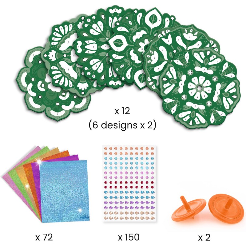 Contenu : 2 toupies, 12 disques avec zones adhésives (? 10cm), 72 planches de matières métallisées de différents coloris, 150 "pierres précieuses" autocollantes, 1 notice explicative.