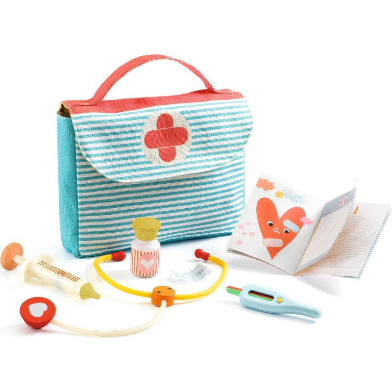 La mallette de docteur Pomea de Djeco est une jolie petite trousse de docteur avec tous les accessoires nécessaires pour examiner et soigner une poupée malade. Le sac en tissu élégant contient : 1 thermomètre qui s'affiche en rouge si la poupée a de la fièvre et en vert si la température est correcte, 1 stéthoscope, 1 seringue pour les vaccinations, 1 pot à médicaments, 1 sparadrap et un carnet où la santé et le développement de la poupée peuvent être notés dans des tableaux.