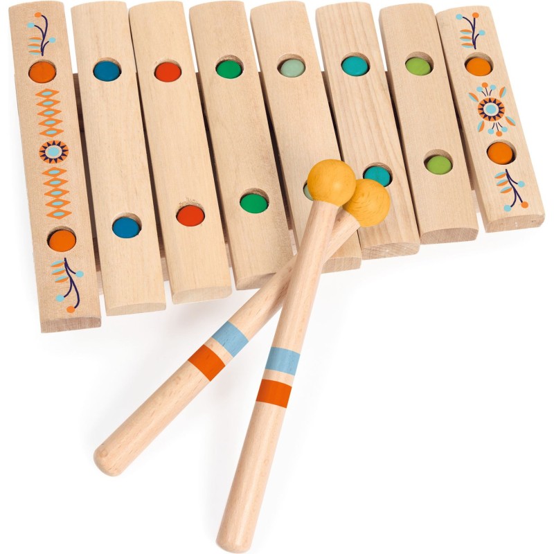 Xylophone 8 barres joliment décoré avec 2 baguettes en bois. L'enfant deviendra très vite un petit musicien avec les partitions qui reprennent les codes couleurs des touches. Le cadeau idéal pour les petits musiciens à partir de 3 ans.