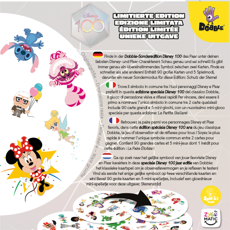 Dobble fête les 100 ans de Disney ! Retrouvez tous les personnages et symboles qui ont marqué des millions de petits et grands durant les 100 ans d’existence des studios Disney ! Dobble est un jeu testant votre rapidité et votre sens de l’observation. Le but est simple : être le premier à trouver le dessin identique entre deux cartes.