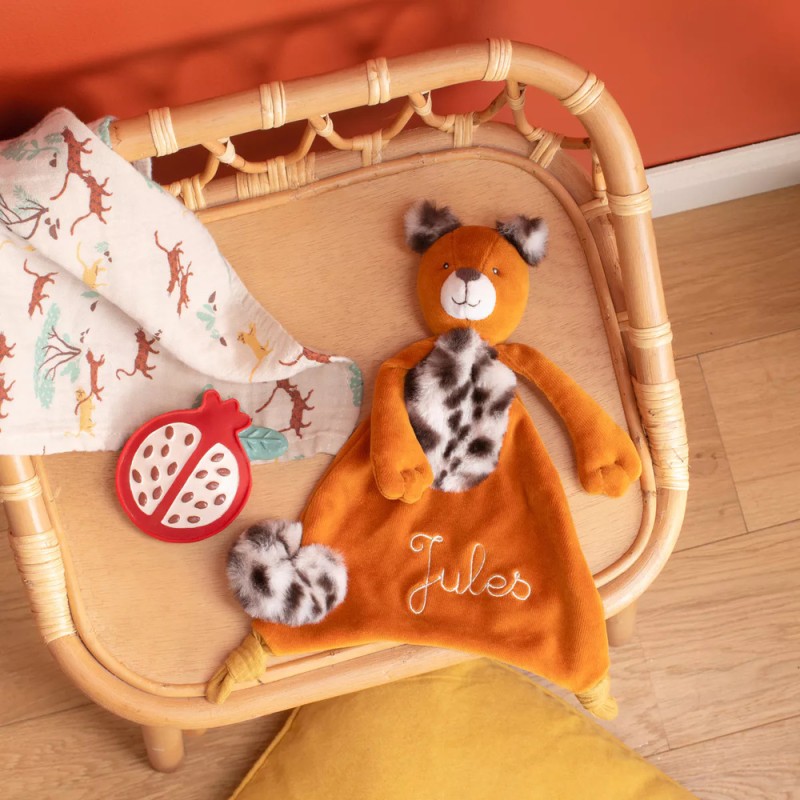 Doudou Taïgo le tigre avec sa fourrure tâchetée et ses grandes pattes. Sa queue se transforme en attache tétine à scratcher sur l'avant. Il sera le compagnon parfait pour surveiller bébé en quête de nuits paisibles. Il peut être brodé au prénom de l'enfant