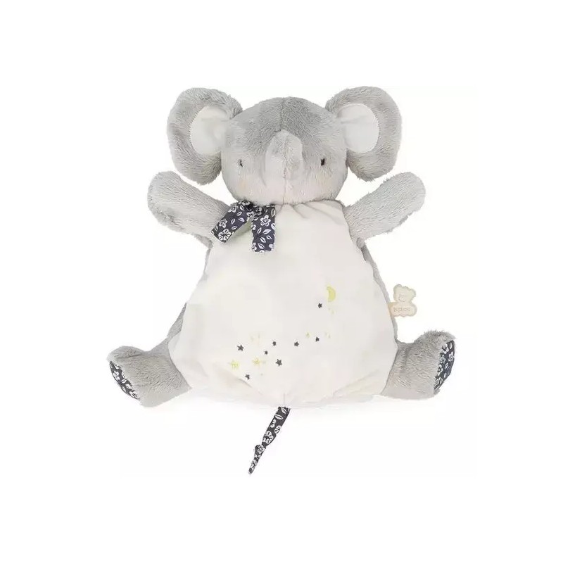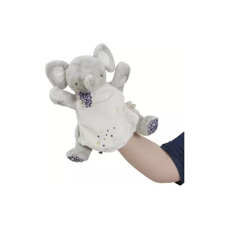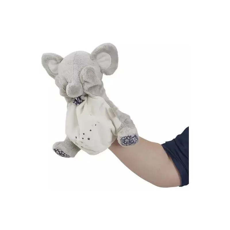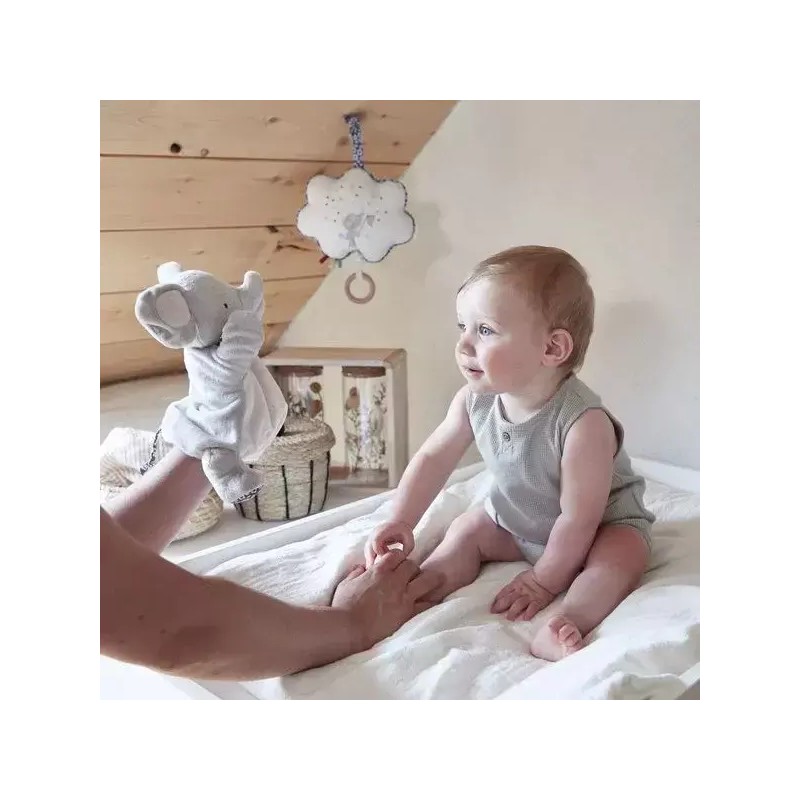 Un éléphant rêveur vient animer la comptine "Brille, brille petite étoile" auprès de bébé dans sa version marionnette. Des oreilles et une trompe à saisir, et des broderies raffinées sur son ventre : le voilà prêt à s'agiter et raconter toutes sortes d'histoires ! Bi-matières, avec du micro-velours et du super-velours extra doux, ce doudou marionnette enveloppe l'enfant de douceur dès la naissance. Adaptée aux mains des adultes, la marionnette est idéale pour mimer la célèbre comptine et capter l'attention de bébé pour un moment d'échange intense et privilégié. Un doudou marionnette qui danse, fait des bisous, mais stimule également le langage et l'imagination du tout-petit pour un éveil des sens tout en douceur. Une fois la petite chanson terminée, le doudou marionnette restera aux côtés de bébé pour l'accompagner vers un doux sommeil. Cette marionnette en tissu est lavable en machine, elle est composée de rembourrage en polyester recyclé certifié Grs.