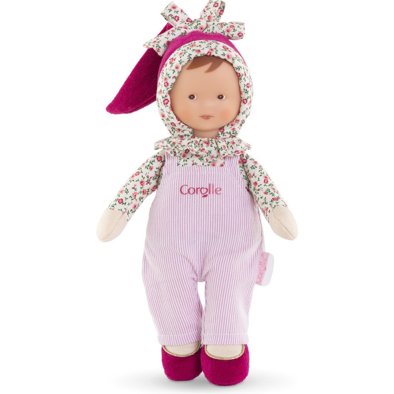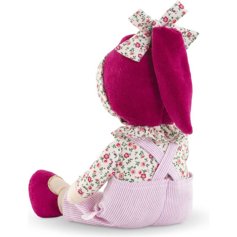 Le doudou Miss Chic Rose Grenadine a la peau blanche et les yeux marron peints. La Miss est habillée d'une salopette rose à rayures framboise avec une jolie collerette fleurie autour du cou. Sa toile de corps est imprimée dans un joli motif fleuri. Elle porte un bonnet rose framboise tout doux et un joli noeud avec des fleurs.