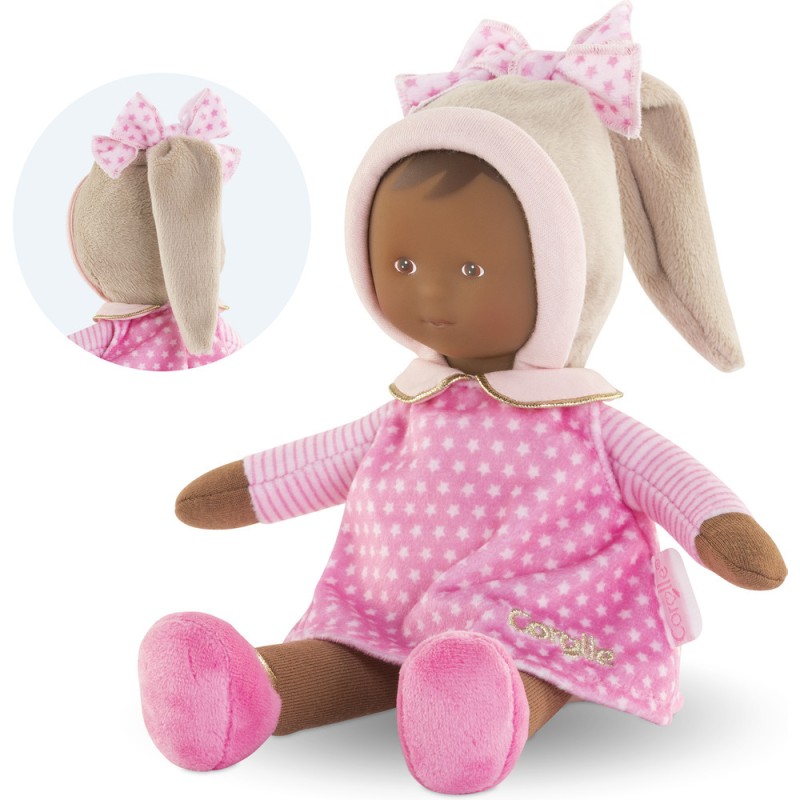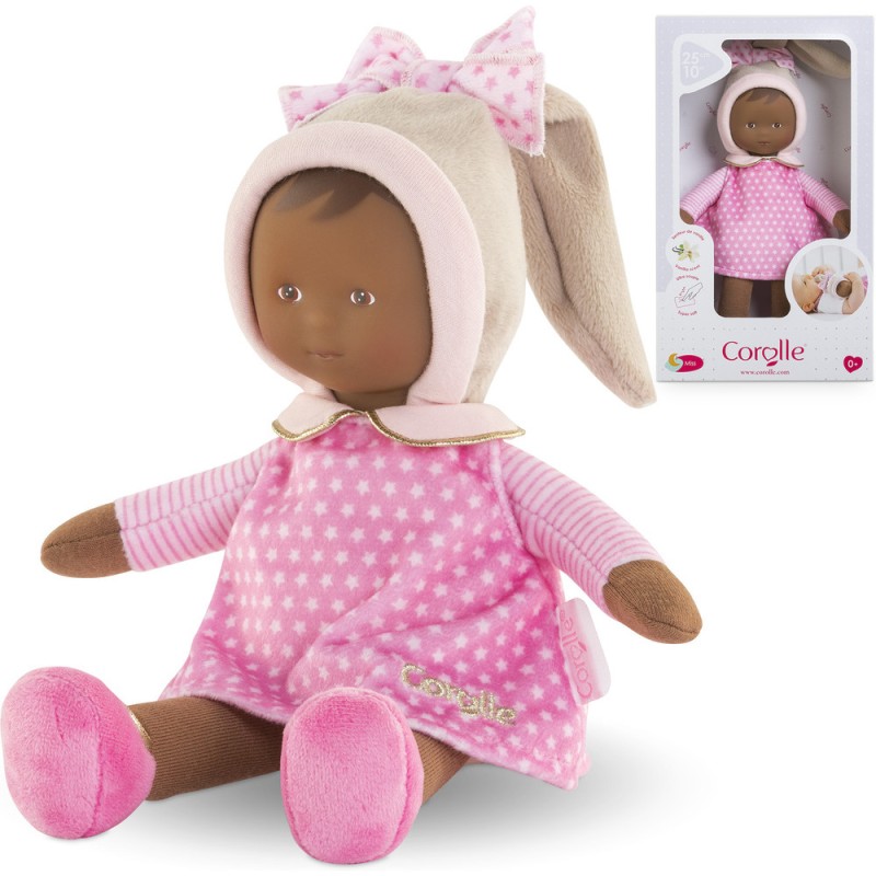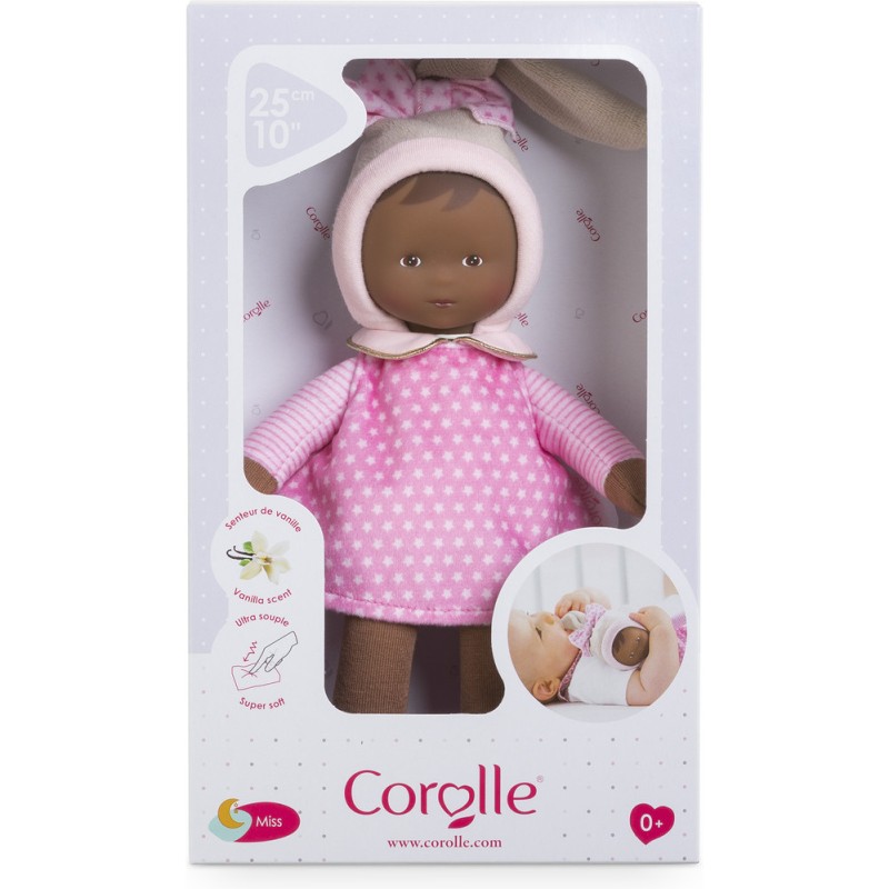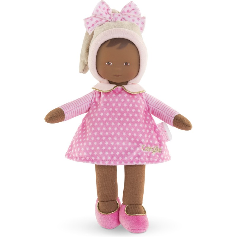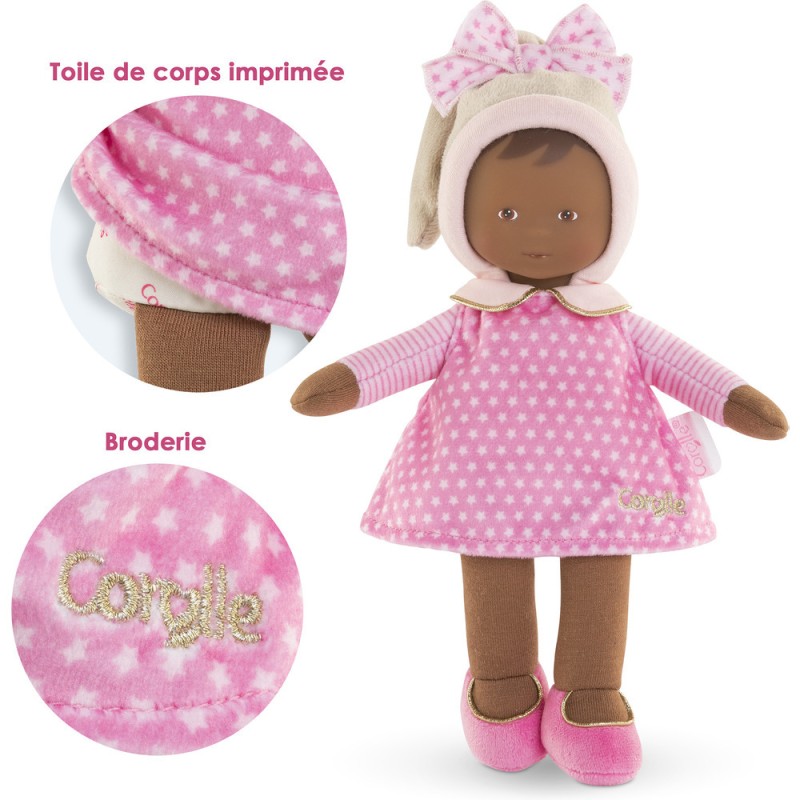 La Miss est habillée d'une robe rose à imprimé étoiles. Elle porte un bonnet beige tout doux et un joli noeud avec des étoiles blanches. De jolis détails dorés visibles sur le col claudine, les ballerines et la jolie broderie Corolle viennent sublimer cette Miss. Lavable en machine, cycle délicat. mon doudou Corolle : Toi et moi, pour toujours. Dès la naissance.