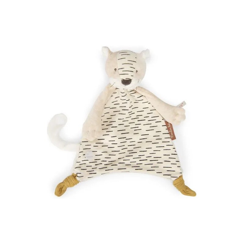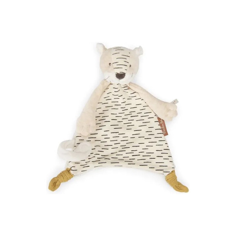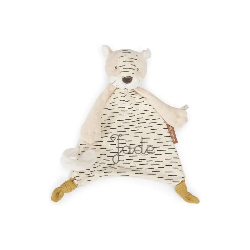 Doudou Baboo le tigre avec sa tête ronde et ses grandes pattes. Sa queue se transforme en attache tétine à scratcher sur l'avant. Il sera le compagnon parfait pour surveiller bébé en quête de nuits paisibles. Il peut être brodé au prénom de l'enfant.
