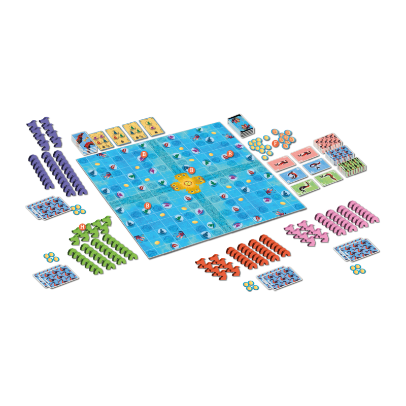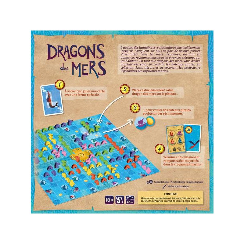 Dans Dragons des mers, chaque joueur incarne un clan de dragons marins ayant pour mission de collecter des trésors et de protéger les quatre royaumes marins. Au fil des tours, jouez des cartes Motifpour positionner vos dragons sur le plateau, augmenter votre présence dans les quatre royaumes et collecter des trésors.
