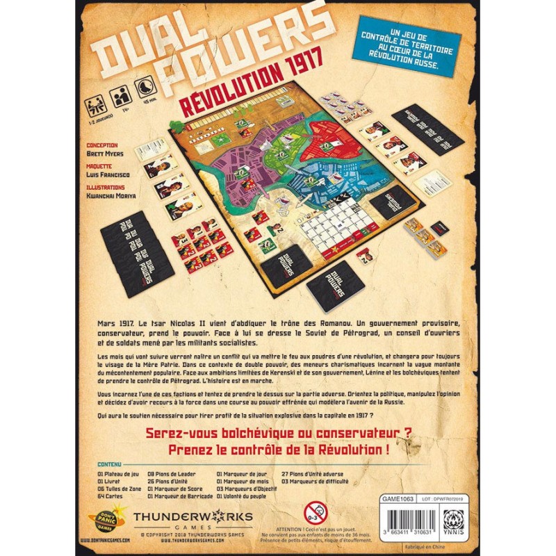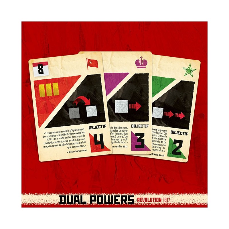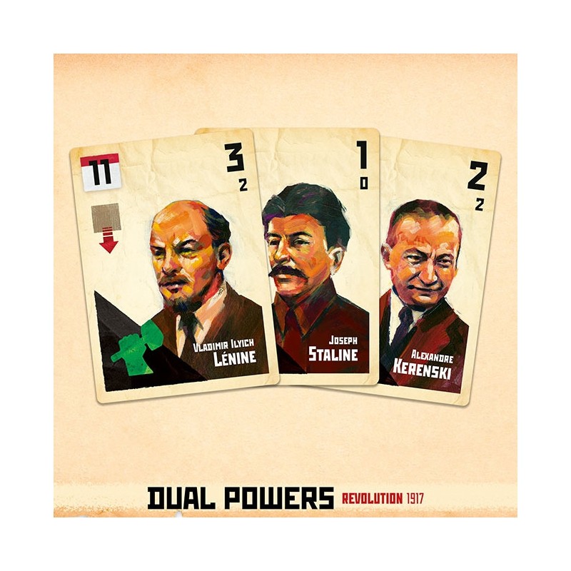 Mars 1917. Le tsar Nicolas Ii vient d’abdiquer le trône des Romanov. Un gouvernement provisoire, conservateur, prend le pouvoir. Face à lui se dresse le Soviet de Petrograd, un conseil d’ouvriers et de soldats mené par les militants socialistes. Les mois qui vont suivre verront naître un conflit qui va mettre le feu aux poudres d’une révolution, et changera pour toujours le visage de la Mère Patrie. Dans ce contexte de double pouvoir, des meneurs charismatiques incarnent la vague montante du mécontentement populaire. Face aux ambitions limitées de Kerenski et de son gouvernement, Lénine et les bolchéviques tentent de prendre le contrôle de Petrograd. L’histoire est en marche. Dans Dual Powers : Révolution 1917, chaque joueur dirige les forces du gouvernement provisoire ou du Soviet par l’action politique, la manipulation et le conflit militaire. Le joueur avec le plus de soutien à la fin de la partie sera en mesure de modeler le futur de la Russie, et de lancer – ou d’étouffer – la guerre civile qui se profile à l’horizon. Qui aura le soutien nécessaire pour tirer profit de la situation explosive dans la capitale en 1917 ? Un système simple et élégant, facile à expliquer mais aux implications profondes et complexes.