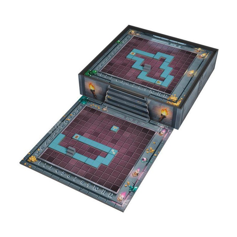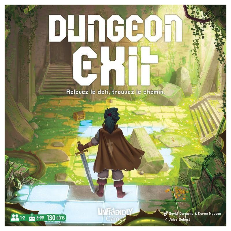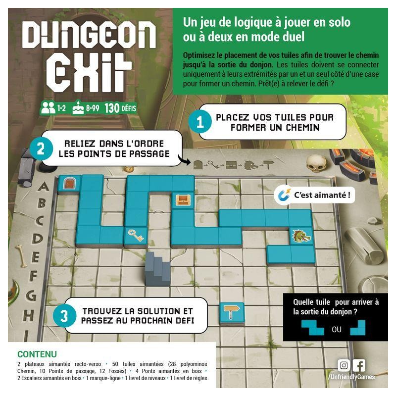 Dans Dungeon Exit, le but est de réussir à trouver un chemin, de la porte jusqu’à la sortie du donjon, en passant par la clé, le coffre, puis le monstre. En solo, résolvez tous les niveaux un à un, progressivement. À 2 joueurs, soyez le plus rapide à trouver un chemin pour remporter la partie.