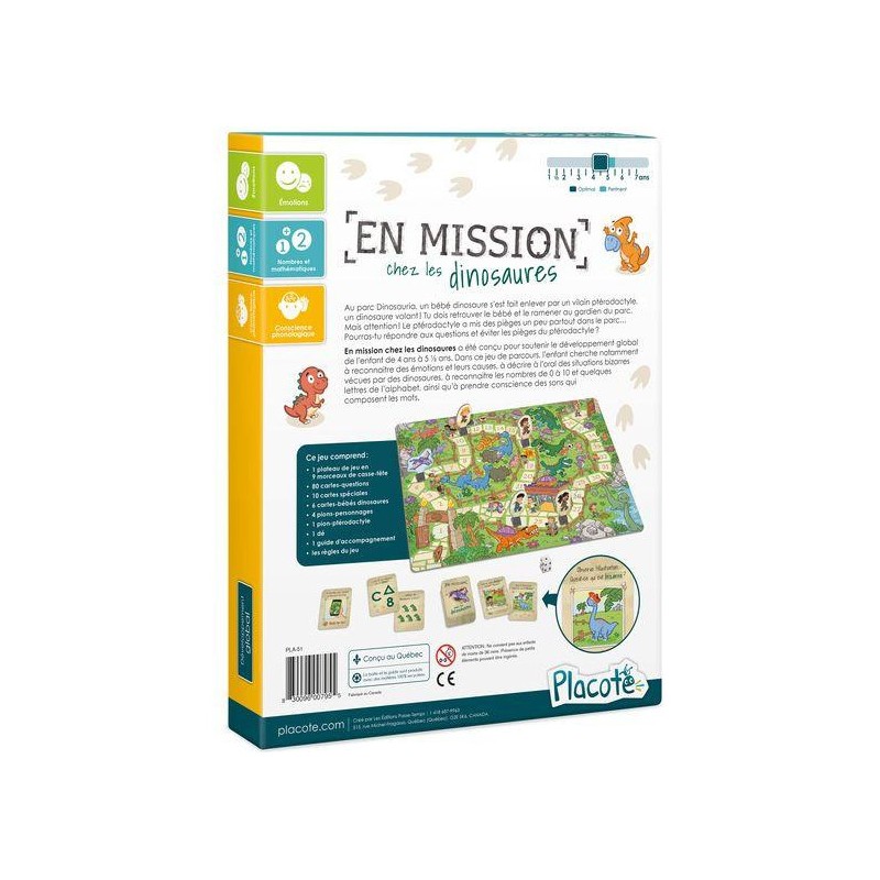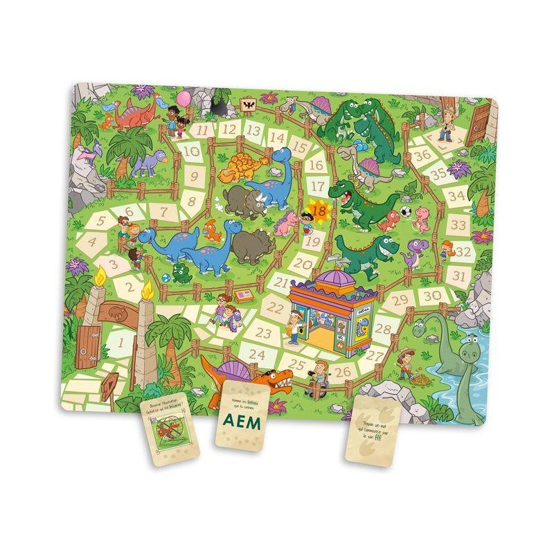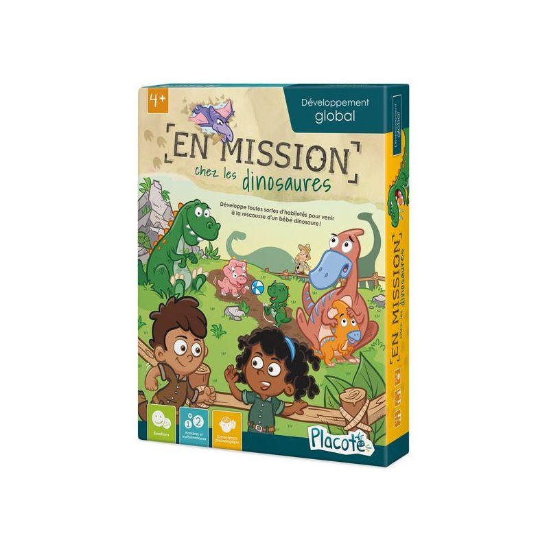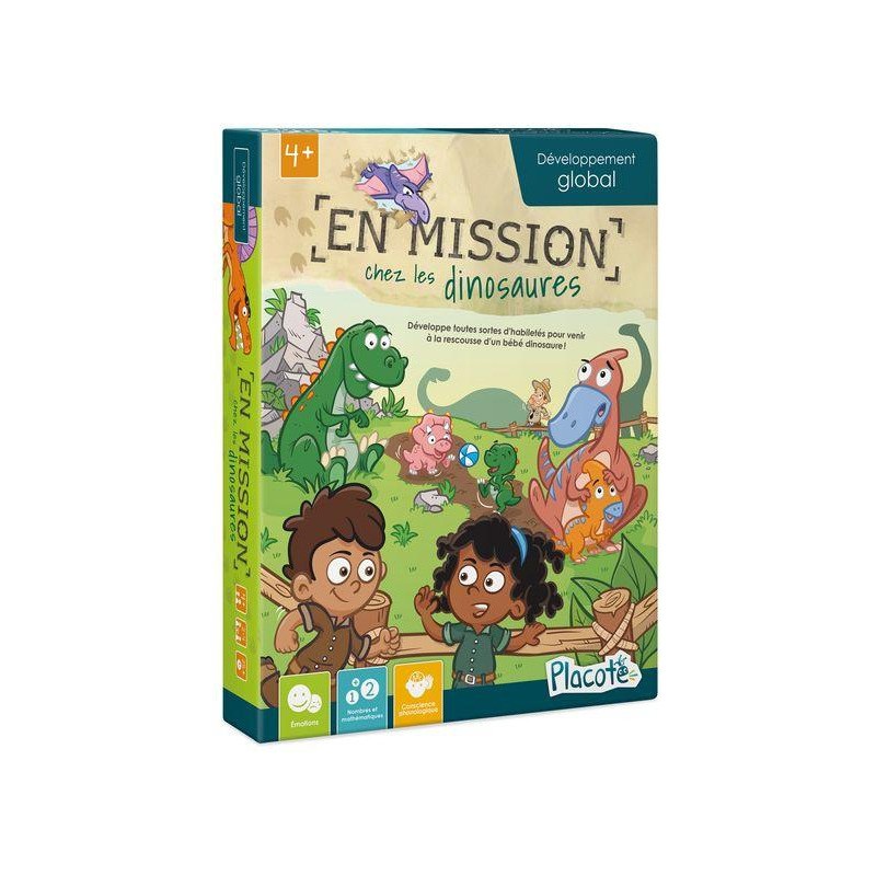 En mission chez les dinosaures est un jeu captivant qui combine le plaisir d'un jeu de parcours avec des défis éducatifs, offrant aux enfants une aventure divertissante tout en stimulant leur apprentissage et leur développement cognitif. Une expérience enrichissante qui les emmène dans un voyage passionnant à travers l'ère des dinosaures, tout en leur offrant une expérience de jeu compétitive et amusante.