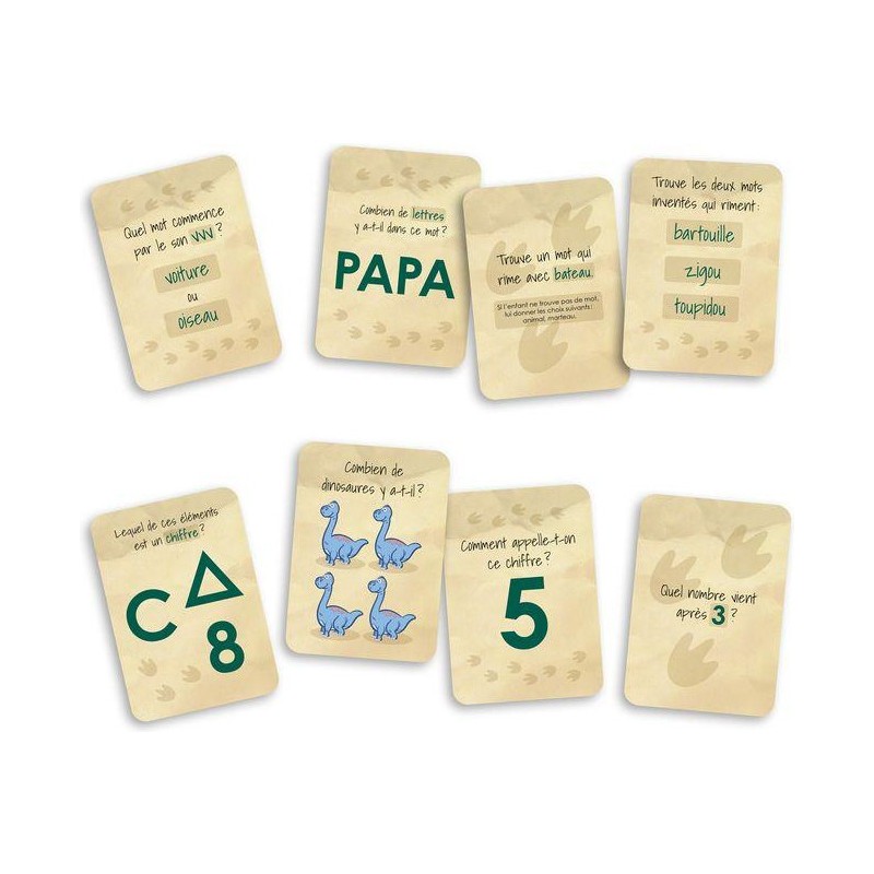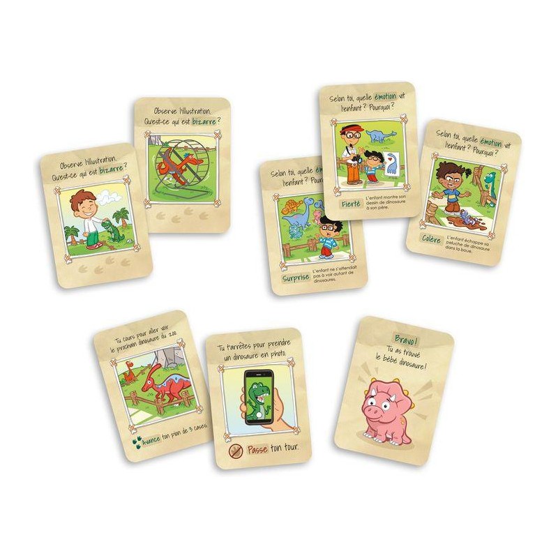 Contenu : , 1 plateau de jeu en 9 morceaux de casse-tête, 80 cartes-questions, 10 cartes spéciales, 6 cartes-bébés dinosaures, 4 pions-personnages, 1 pion-ptérodactyle, 1 dé, 1 guide d'accompagnement, les règles du jeu