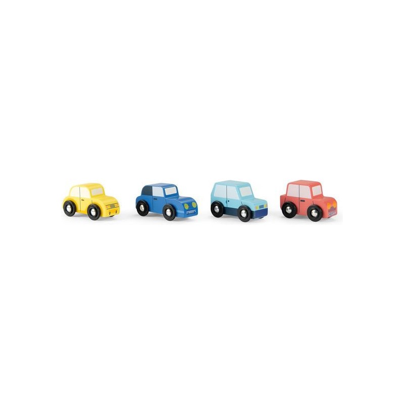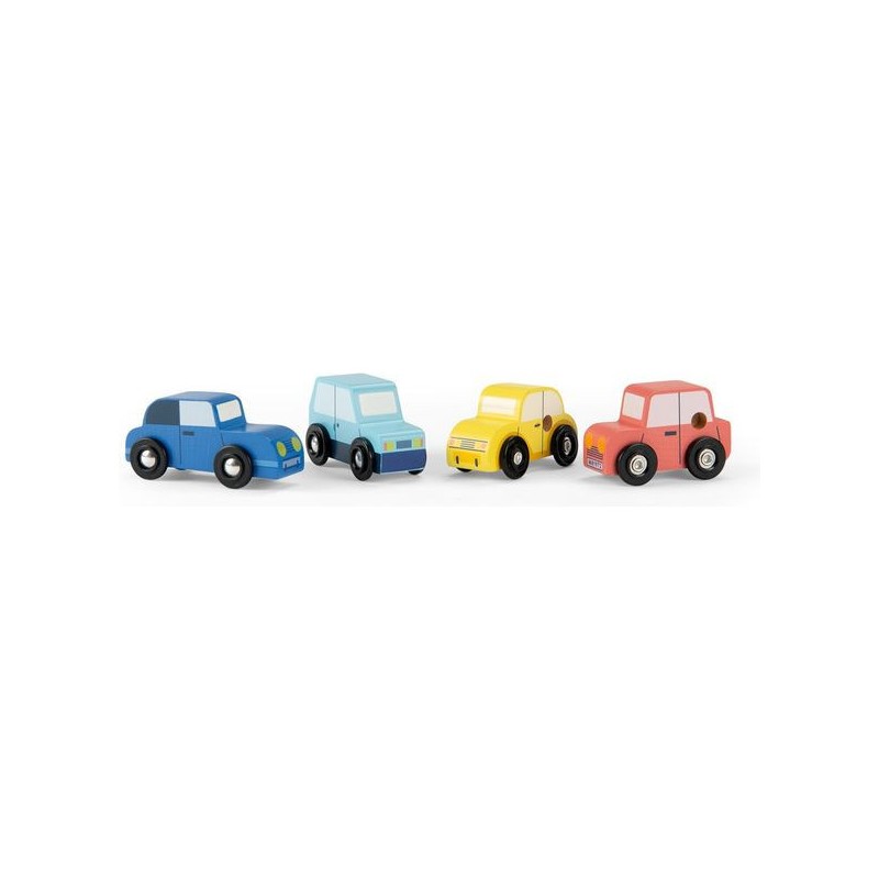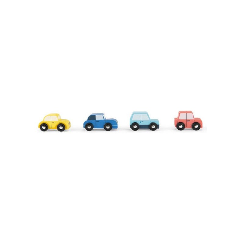 Coffret de 4 voitures rétro colorées et en bois, spécialement conçues pour plaire aux plus petits. Les voitures sont peintes avec de petits détails et les roues Pe avec axe en aluminium roulent sans problème sur n'importe quelle surface plane.