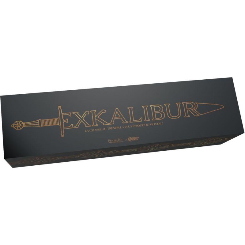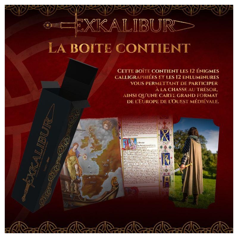 Contenu : Exkalibur contient :, 1 carte au trésor grand format de l'Europe de l'Ouest médiévale, pliée façon carte routière, 1 parchemin comportant 12 énigmes calligraphiées, 1 parchemin comportant 12 enluminures, 1 notice de présentation de la chasse au trésor,