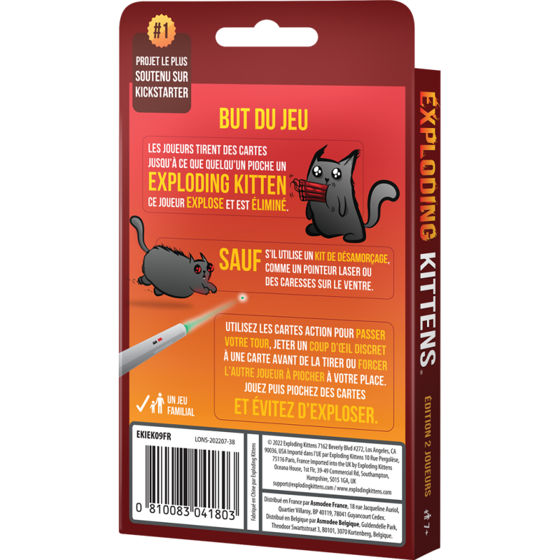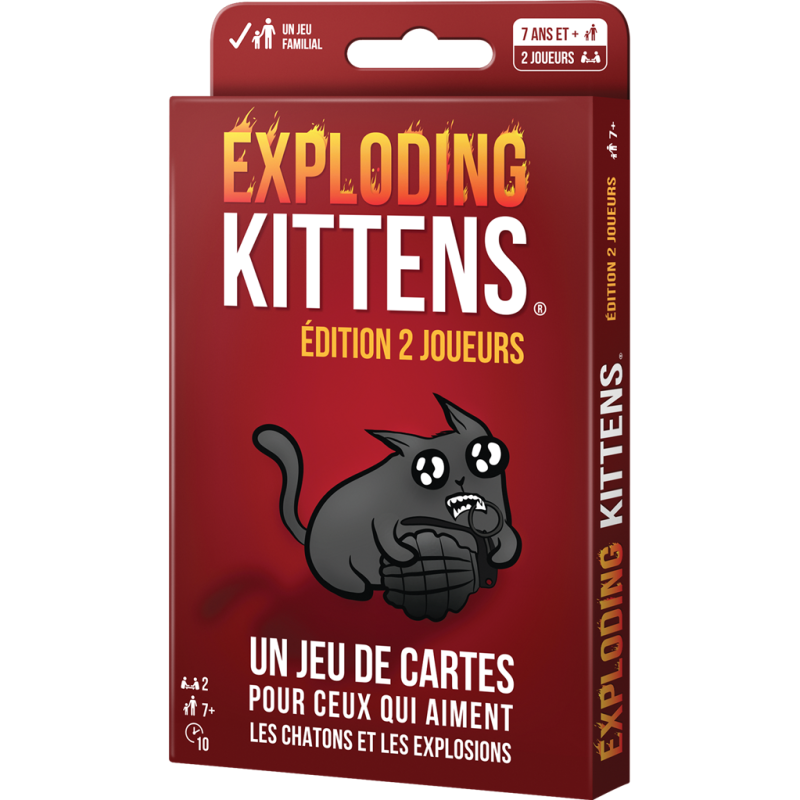 Le paquet contient une Carte Exploding Kitten. Vous jouez à tour de rôle en tirant des cartes jusqu’à ce que l’un de vous pioche le Chaton Explosif (Exploding Kitten). Lorsque cela se produit, ce joueur explose. Il meurt et est éliminé, son adversaire remporte la partie. Toutes les autres cartes ont des effets redoutables qui vous aideront à éviter d’exploser et à faire exploser votre adversaire ! À chaque tour, jouez une de vos huit cartes et appliquez son effet, ou passer. Dans tous les cas, piochez une nouvelle carte. Si vous tirez le Chaton explosif, vous perdez, à moins de posséder un kit de désamorçage, par exemple. Une version deux joueurs du bestseller de Matthew Inman Contenu 32 cartes, une règle