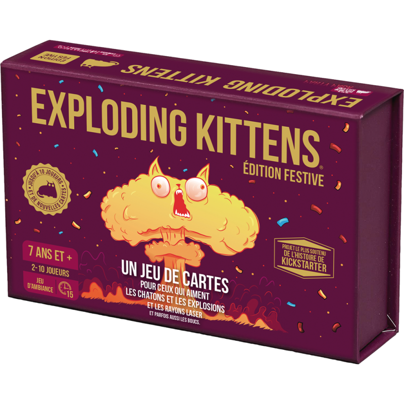 Retrouvez Exploding Kittens dans cette nouvelle édition du jeu avec des chats le plus célèbre. Vous pourrez y jouer de 2 à 10 grâce à l’App incluse. Exploding kittens, c'est Higlander avec des chatons : à la fin, il ne peut en rester qu'un. Dans Exploding Kittens, vous avez le droit d'avoir tout un tas de cartes en main. Quand vient votre tour, vous pouvez en jouer autant que vous voulez, pour faire les pires crasses à vos amis. Attendez-vous à des effets de cartes violents et stupides, on n'est pas là pour se faire des papouilles ! Quelle que soit votre décision, vous devrez de toute façon piocher une carte et serrer les coussinets pour ne pas tomber sur une carte « Exploding Kittens ». Si c’est le cas, vous avez perdu. Vous pouvez laper un bol de mojito-croquette, tout en admirant les illustrations foutraques et déjantées qui ont fait la renommée de ce petit jeu d'un mauvais goût assumé, en attendant qu'un seul joueur survive à ce déploiement de violence gratuite. Voilà, vous êtes prêts à perdre vos amis. (En même temps, on vous avait prévenus.)