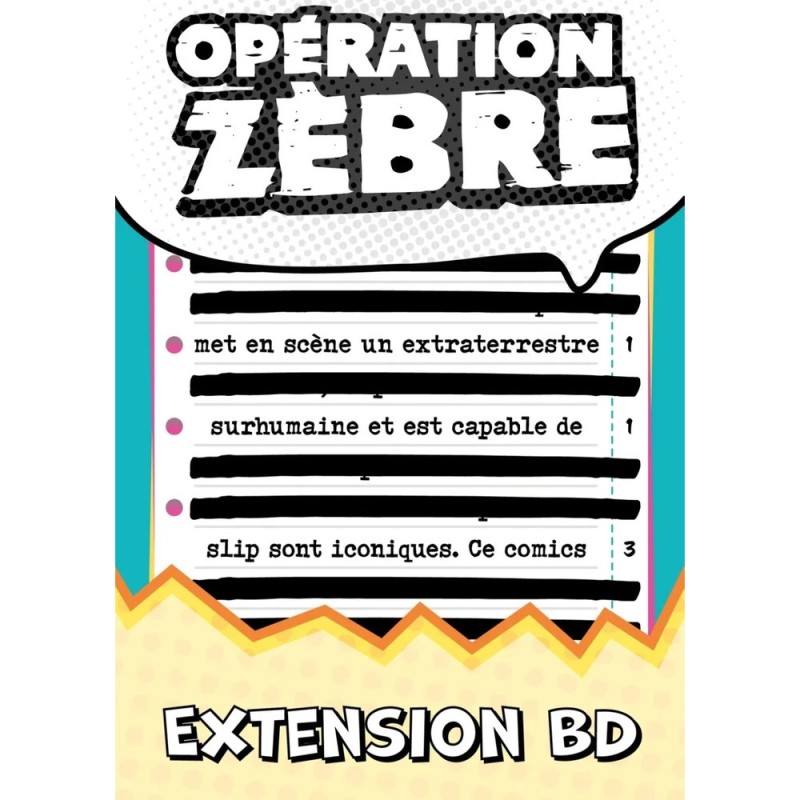 "Opération Zèbre : Extension Bd" est une extension de 55 cartes recto-verso (soit 110 nouvelles cartes à faire deviner) introduisant de nouveaux thèmes,dont la Bande dessinée, à rajouter à votre jeu de base.