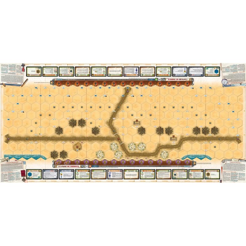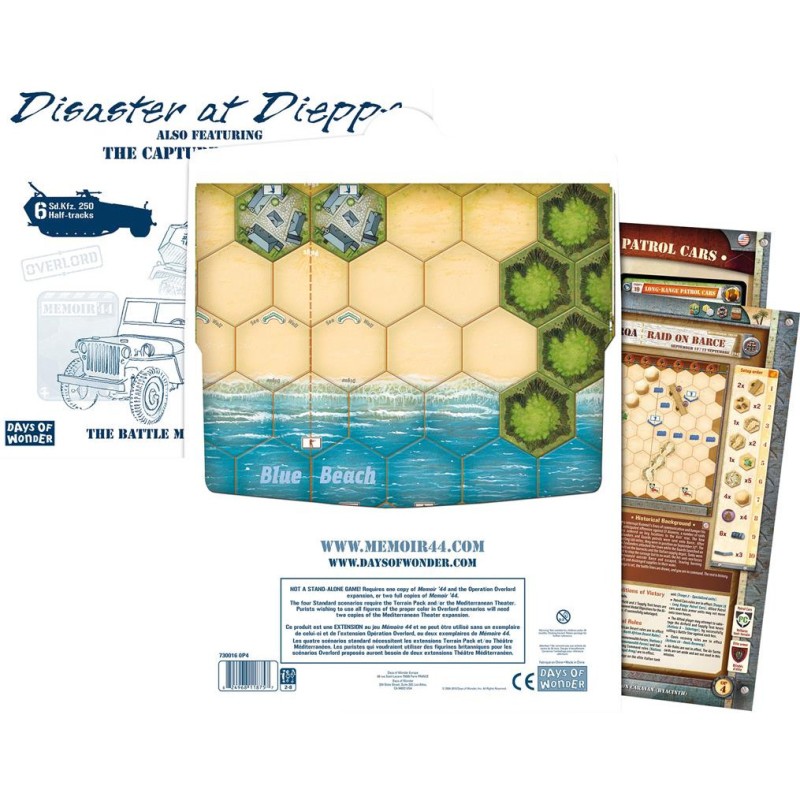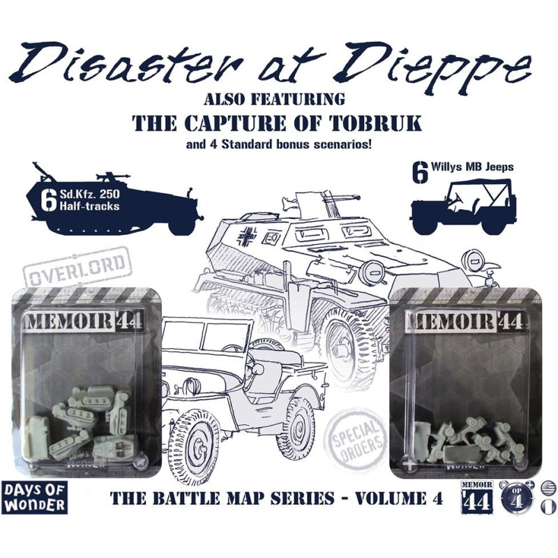 Ce dernier volume de notre première série de Battle Maps pour Mémoire 44 vous propose deux nouvelles missions Overlord, six half-tracks, six jeeps et quatre scénarios standard. Le désastre de Dieppe L'objectif de l'opération Jubilee était de montrer que les Alliés étaient capables de capturer puis de tenir un port en eaux profondes. Les troupes alliées, principalement des Canadiens, ne pouvaient pas imaginer que l'opération tournerait court en seulement quelques heures... Un dense réseau de barbelés barrait la plage de débarquement, bordée de hautes falaises. Malgré tout, les premières barges accostèrent sans trop de pertes : le Régiment Écossais d'Essex débarqua sur Red Beach et le Régiment d'Infanterie Légère d'Hamilton sur White Beach, où les soldats purent s'abriter derrière une digue. Hélas, les blindés du 14e Bataillon de Chars Canadiens arrivèrent en retard. De plus, une fois à terre, ils ne purent que difficilement se déplacer, leurs chenilles patinant sur les galets de la plage. Le Régiment Royal Canadien, qui devait débarquer sur Blue Beach, arriva également avec du retard : cloués au sol dès leur arrivée par un feu d'enfer, ses hommes ne purent s'emparer des falaises qui dominaient les plages de débarquement. Les forces allemandes balayaient maintenant toute la plage de leur feu, faisant subir de lourdes pertes aux Canadiens. Le casino et les abris fortifiés alentour changèrent plusieurs fois de main, mais sans résultat. Lorsque l'ordre de la retraite fut donné, 60% des hommes qui avaient débarqué avaient été tués, blessés ou capturés par l'ennemi. La leçon fut douloureuse pour les Alliés, mais les enseignements qu'ils en tirèrent leur permirent de préparer le débarquement de Normandie, qui allait avoir lieu deux ans plus tard. La prise de Tobrouk Après avoir écrasé les défenses britanniques de Gazala, Rommel et son Afrikakorps avancèrent vers Tobrouk. La ville avait tenu un siège de neuf mois l'année passée et était maintenant défendue par la 2e Division Sud-Africaine du général Klopper. Le périmètre de défense était constitué de barbelés, de champs de mines et de positions renforcées d'infanterie, avec quelques chars et pièces d'artillerie en soutien. Le 20 juin, sous le couvert de la brume matinale, le Génie allemand ouvrit des voies dans les défenses. Lorsque la brume se leva, les Britanniques furent pris sous un intense barrage d'artillerie suivi d'un bombardement aérien, puis les chars et les fantassins allemands se ruèrent à l'assaut. Leur avance fut néanmoins stoppée par une courageuse contre-attaque de blindés soutenus par de l'artillerie, mais à midi, les Allemands s'étaient déjà réorganisés pour reprendre leur progression. Le carrefour Kings Cross finit par tomber, ouvrant la route de Tobrouk. Klopper, abasourdi, ne put que faire hisser le drapeau blanc pour signaler la reddition de ses troupes. Scénarios Standard Quatre scénarios standard sont fournis en plus de ces deux scénarios Overlord : Dans le crochet de Rommel et Raid sur Barqa, les voitures tout-terrain seront des clés essentielles vers la victoire, tandis que dans les Panzers de l'Atlas et Le-Mesnil-Adelée, il faudra judicieusement utiliser vos half-tracks pour l'emporter. Des règles détaillées pour ces deux nouvelles unités sont également incluses dans cette extension. Ce produit est une Extension au jeu Mémoire 44 et ne peut être utilisé sans un exemplaire de celui-ci et de l'extension Opération Overlord, ou deux exemplaires de Mémoire 44. Les quatre scénarios standard nécessitent les extensions Terrain Pack et/ou Théâtre Méditerranéen. Les puristes qui voudraient utiliser les figurines britanniques pour les scénarios Overlord proposés auront besoin de deux extensions Théâtre Méditerranéen.