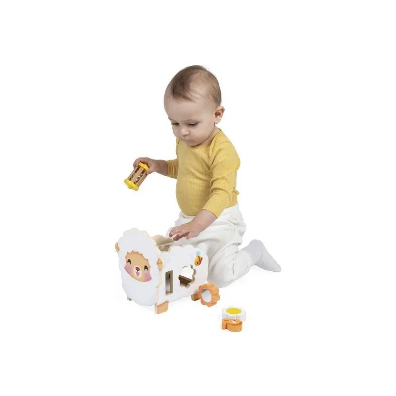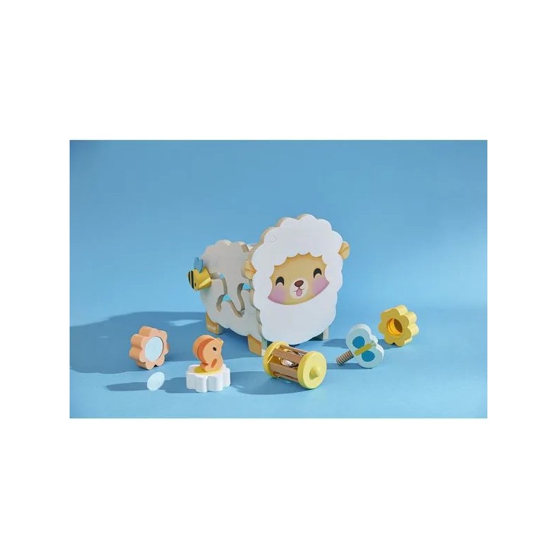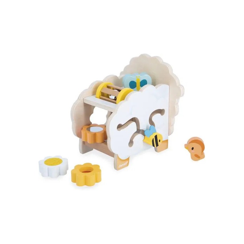 Sur le côté opposé, on retrouve un petit labyrinthe avec une adorable abeille en bois. Le défi pour bébé ? La faire glisser le long de son chemin ! Sur le dos du mouton, on peut y visser un papillon, permettant aux petits de faire leurs premières expériences avec la rotation.