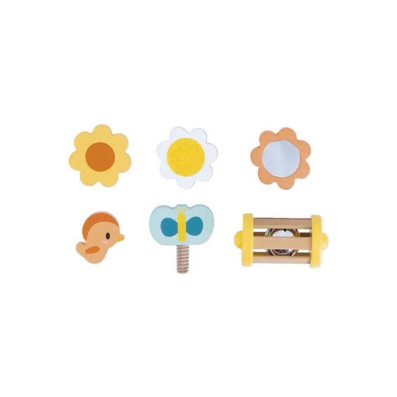 Juste à côté, un petit emplacement est prévu pour accueillir un hochet à grelot : bébé pourra le saisir, le secouer et écouter son doux tintement. C'est parfait pour stimuler l'ouïe dès le plus jeune âge. Malin, les 6 accessoires qui composent ce jouet peuvent aussi se ranger à l'intérieur !