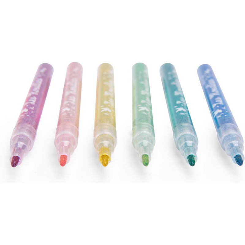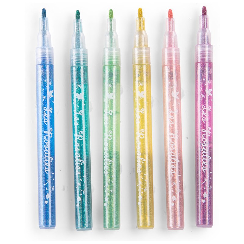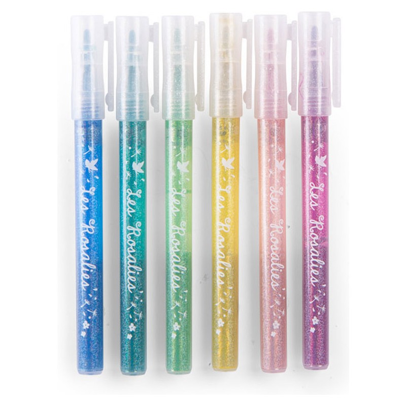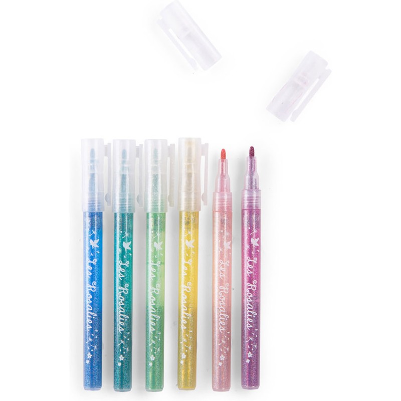 Faites scintiller tous les dessins, coloriages et créations avec ces 6 feutres pailletés Rosalies.  Rangez-les pointe vers le bas pour une utilisation optimale.