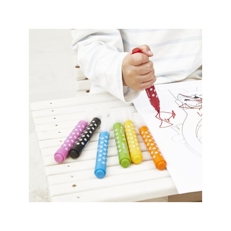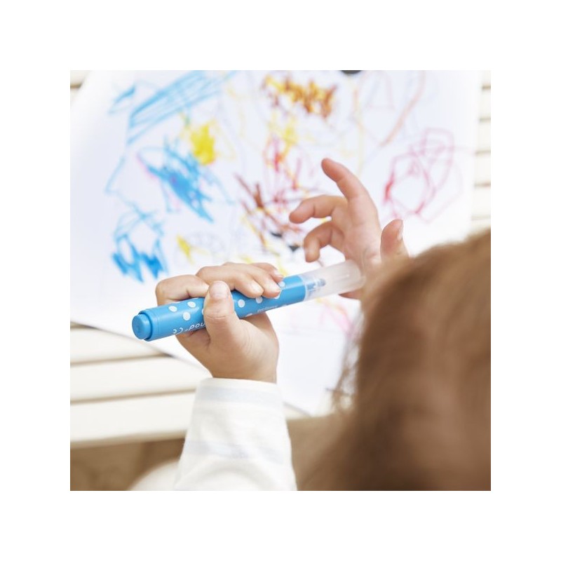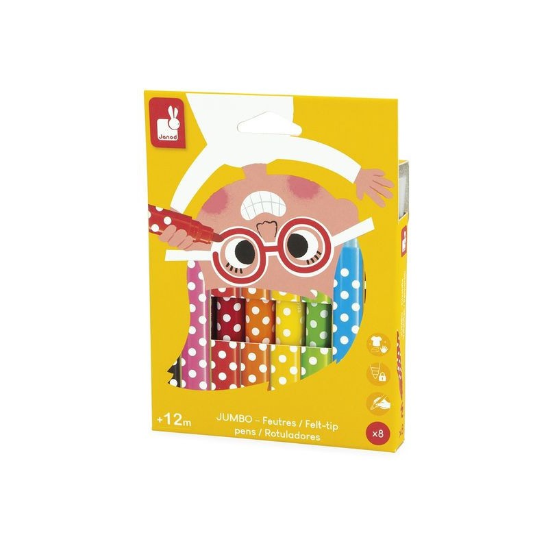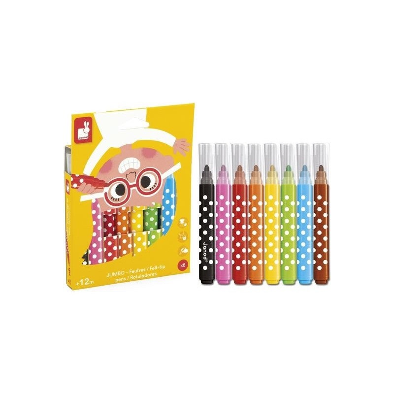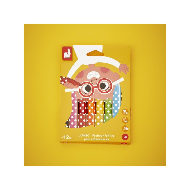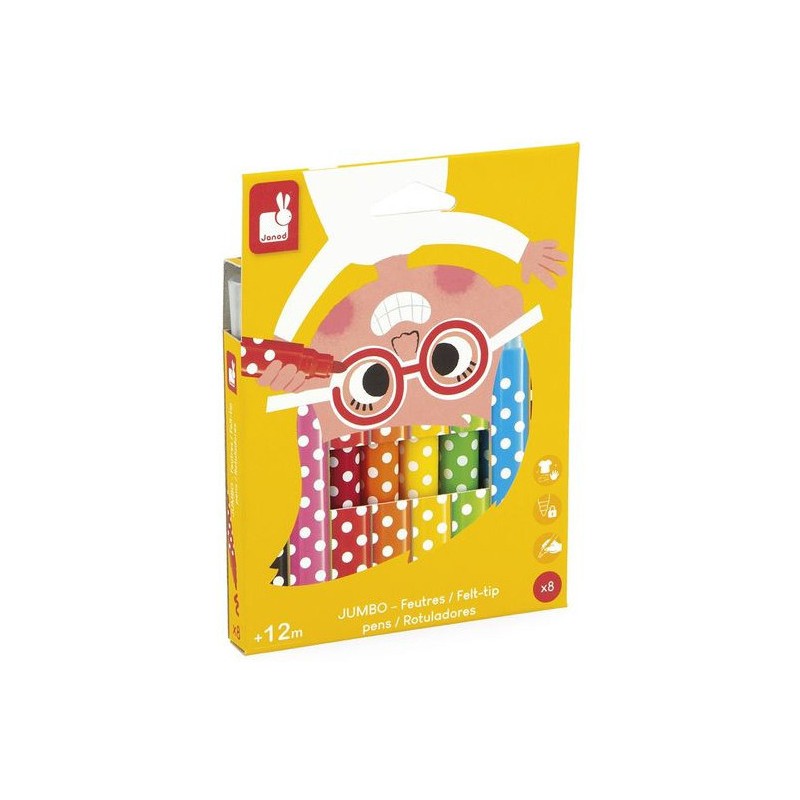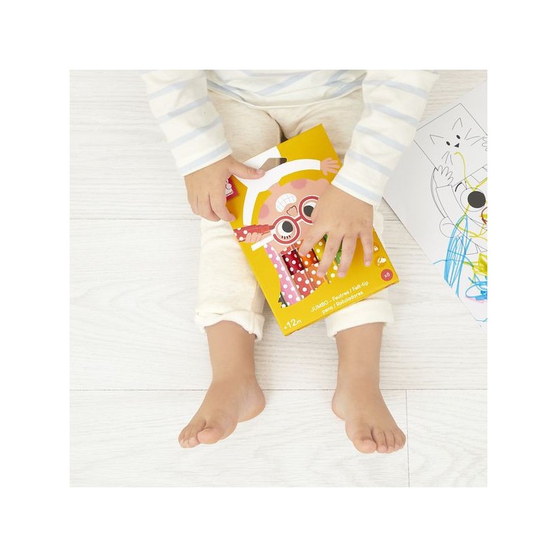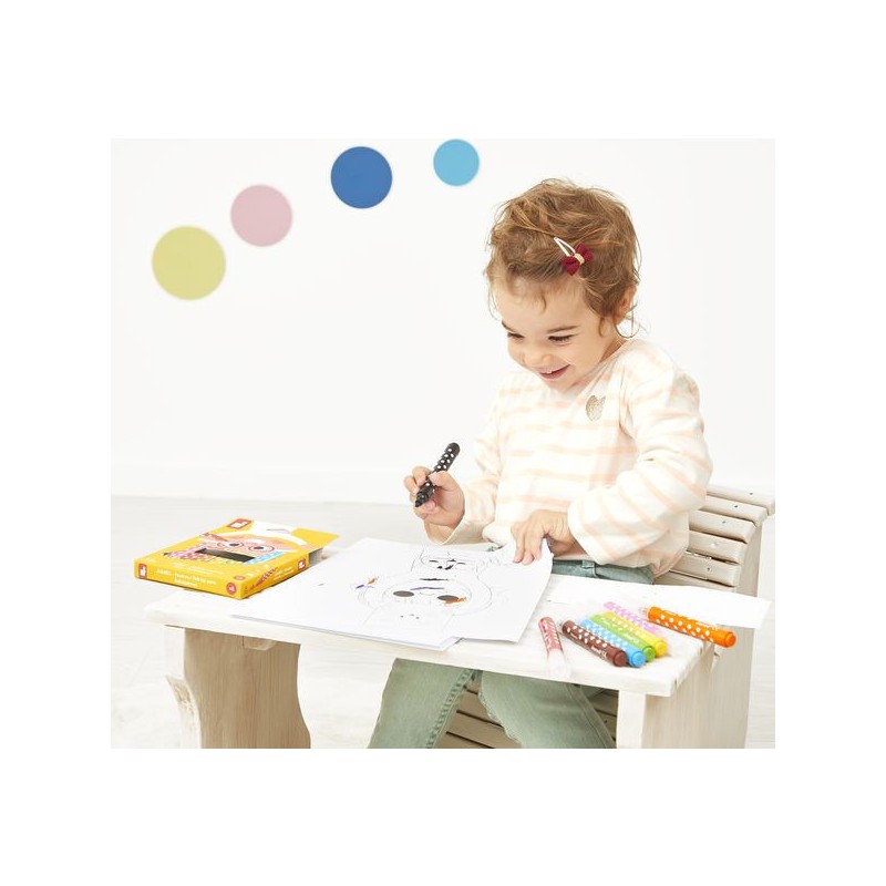 Des feutres format Jumbo ! Avec ce pack de 8 feutres, les petits découvrent les joies du dessin dès l’âge de 12 mois. Ce set de gros feutres est spécialement conçu pour les petites mains, grâce à leur taille et à leur pointe sécurité. Avec ses feutres de grande taille, bébé s’initie au coloriage en toute simplicité. Du marron, du bleu, du vert, du jaune, de l’orange, du rouge, du rose et du noir : tout pour réaliser ses premières créations ! Malin, la pointe est solidement bloquée dans les deux sens et ne peut s’enfoncer ou se retirer. L’encre est facilement lavable. On adore la boite super pratique et réutilisable, pour ranger les feutres après chaque séance de coloriage. En réalisant ses premiers dessins, votre enfant commence à développer sa créativité et travaille sa motricité fine : un super moyen d’aborder le coloriage en prévision de ses prochaines réalisations. Place à la couleur en toute sérénité ! Ce set de 8 feutres pour bébé fait partie de notre gamme « Colo », une collection complète d’articles de coloriage, pour des moments créatifs hauts en couleur dès le plus jeune âge.