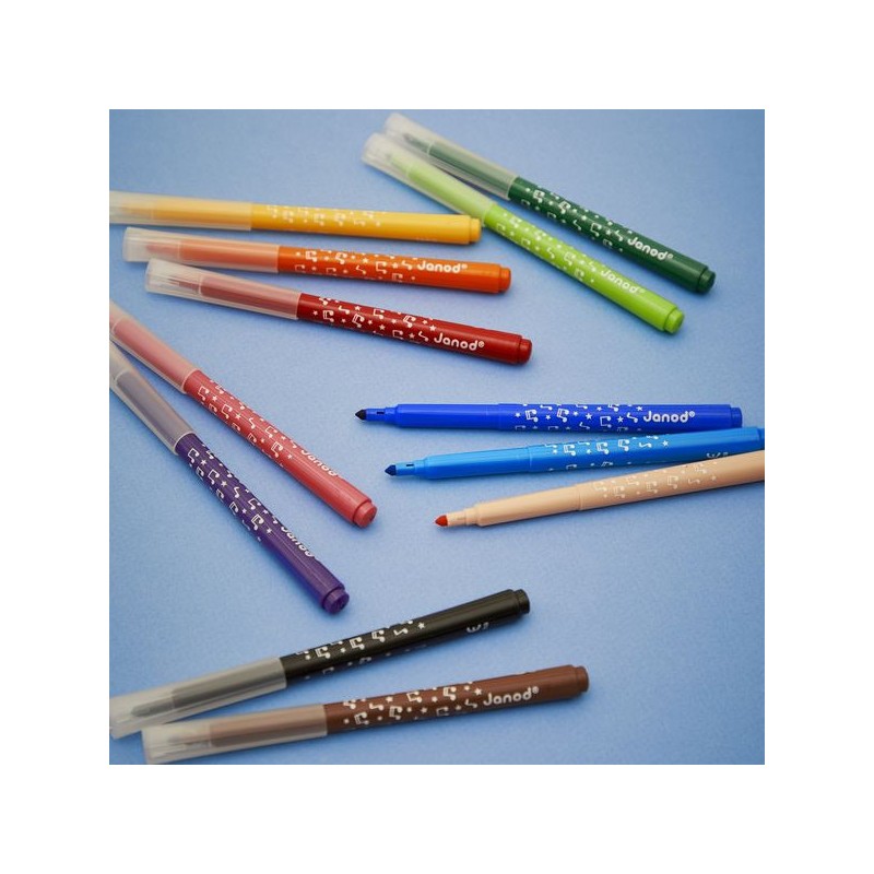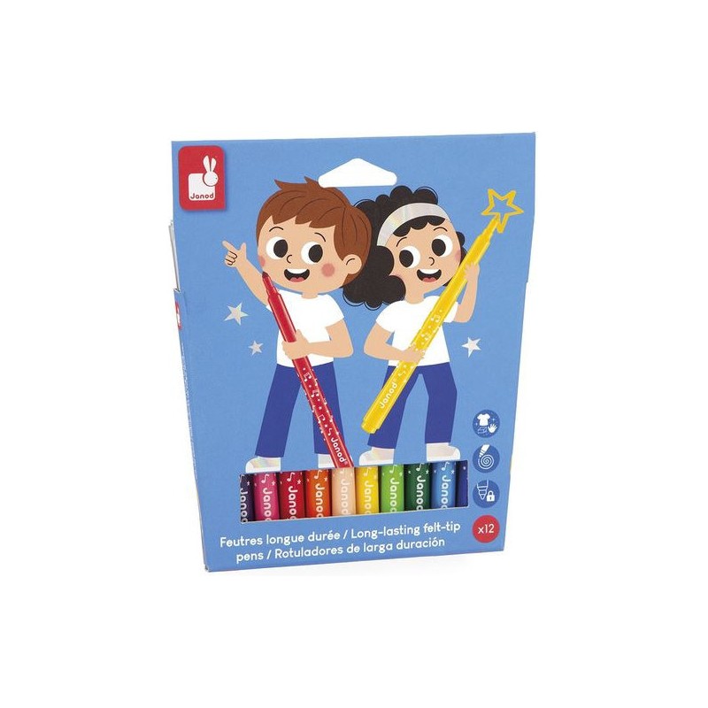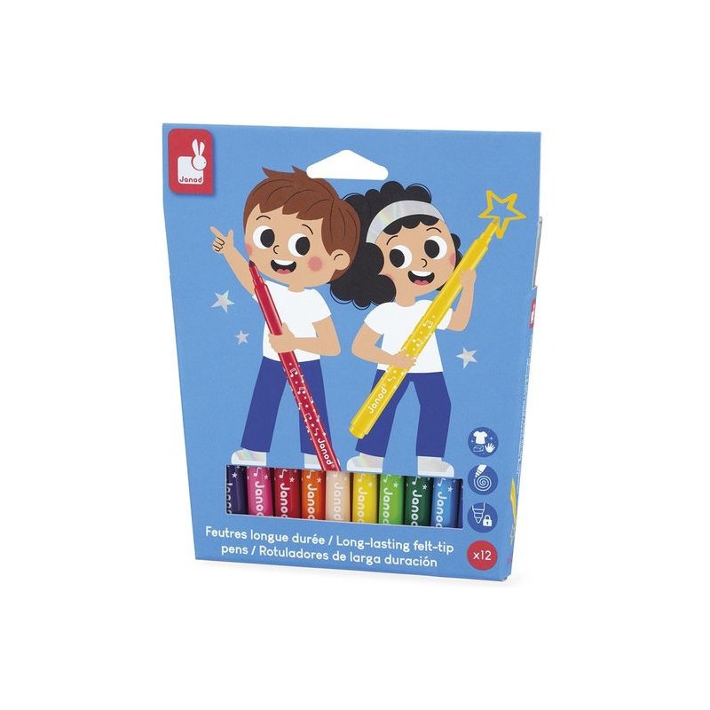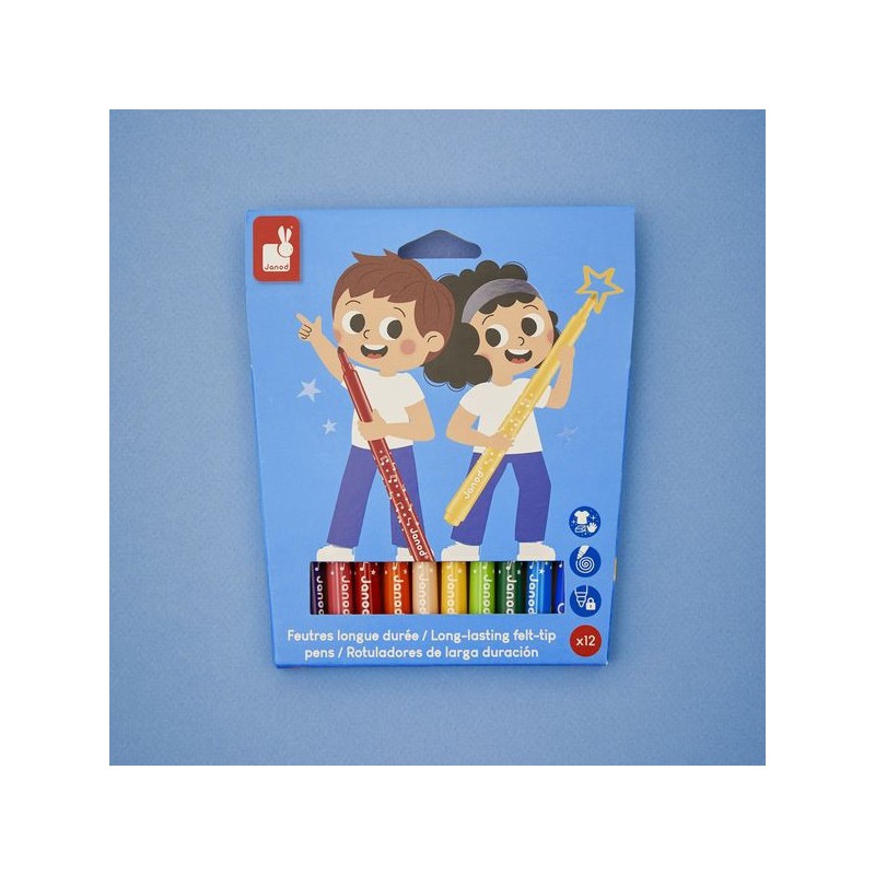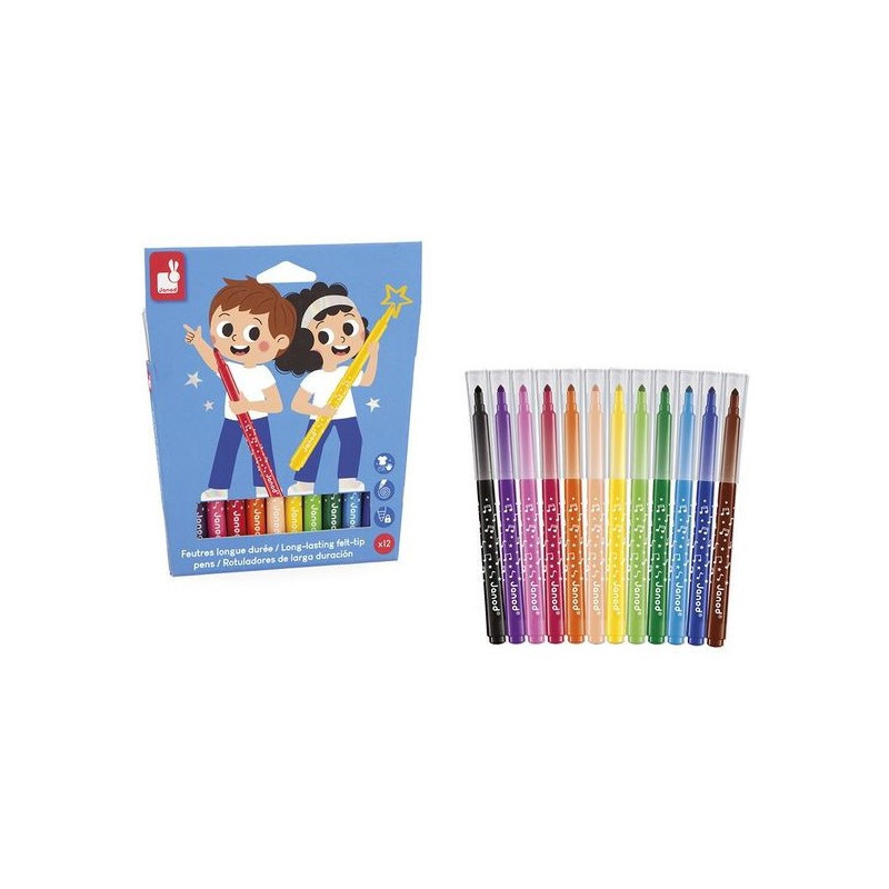 L’indispensable du coloriage ! Avec ce pack de 12 feutres longue durée, les enfants donnent vie à leurs dessins, dès l’âge de 3 ans. Ce set de feutres est spécialement conçu pour durer et apporter longtemps de la couleur aux coloriages des petits ! La pointe conique des feutres permet une grande polyvalence : des lignes fines au coloriage plus large. Du noir, du violet, du rose, du rouge, de l’orange, du beige, du jaune, du vert clair et foncé, du bleu clair et foncé, du marron : tout pour réaliser de beaux dessins colorés ! L’encre est facilement lavable, ce qui est toujours un plus. On adore la boite super pratique et réutilisable, pour ranger les feutres après chaque séance de coloriage. En réalisant ses premiers dessins, votre enfant développe sa créativité et travaille sa motricité fine. Place à la couleur, et pour longtemps ! Ce set de 12 feutres longue durée fait partie de notre gamme « Colo », une collection complète d’articles de coloriage, pour des moments créatifs hauts en couleur dès le plus jeune âge.