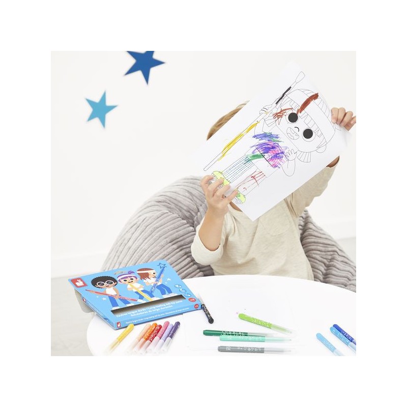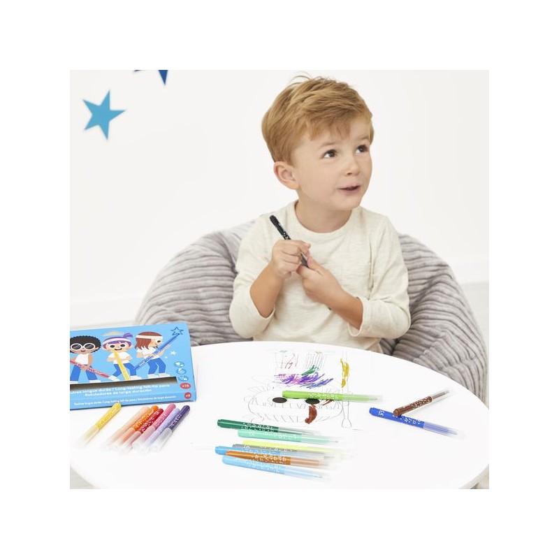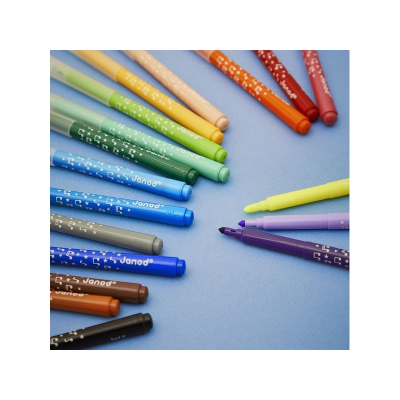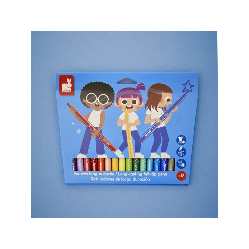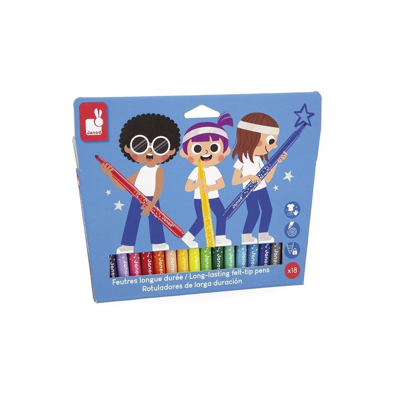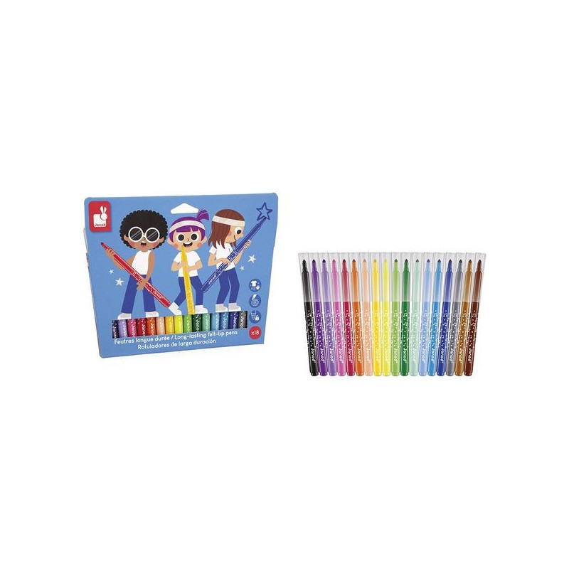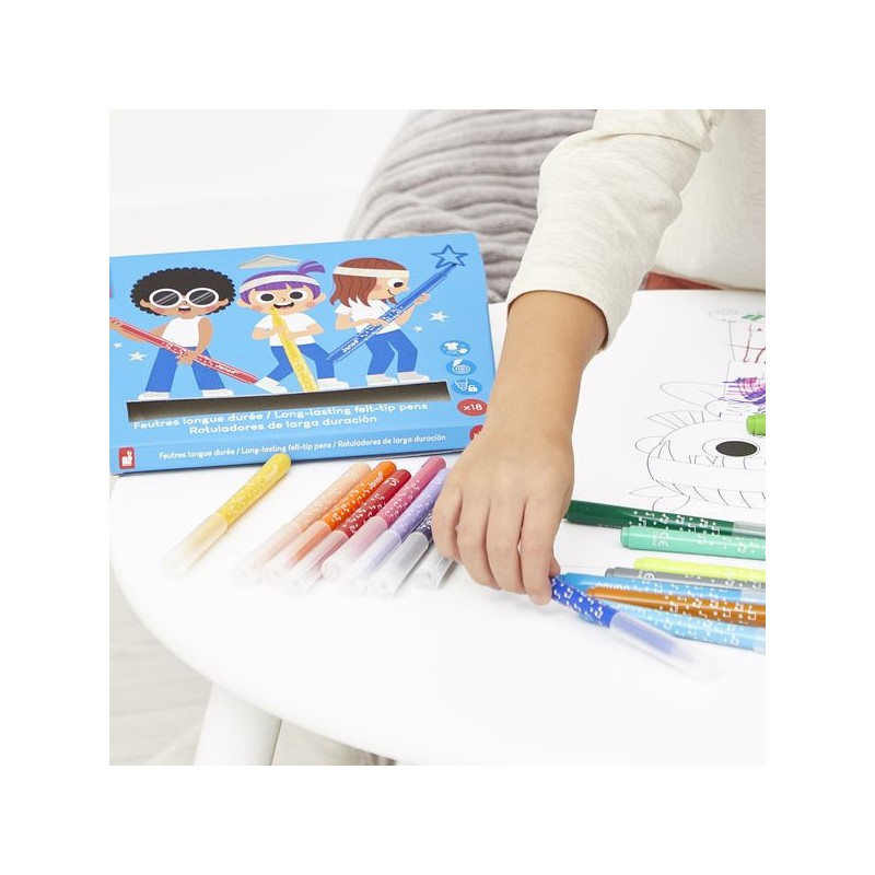 L’incontournable du coloriage ! Avec ce pack de 18 feutres longue durée, les enfants donnent vie à leurs dessins, dès l’âge de 3 ans. Ce set de feutres est spécialement conçu pour durer et apporter longtemps de la couleur aux coloriages des petits ! La pointe conique des feutres permet une grande polyvalence : des tracés fins au coloriage plus large. Du noir, des nuances de violet, du rose, du rouge, de l’orange, du beige, des nuances de jaune, du vert clair et plus foncé, des nuances de bleu, du gris et du marron : tout pour réaliser de beaux dessins colorés et nuancés ! L’encre est facilement lavable, ce qui est toujours un plus. On adore la boite super pratique et réutilisable, pour ranger les feutres après chaque séance de coloriage. En réalisant ses premiers dessins, votre enfant développe sa créativité et travaille sa motricité fine. Place à la couleur, et pour longtemps ! Ce set de 18 feutres longue durée fait partie de notre gamme « Colo », une collection complète d’articles de coloriage, pour des moments créatifs hauts en couleur dès le plus jeune âge.