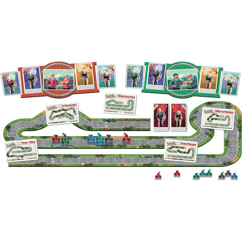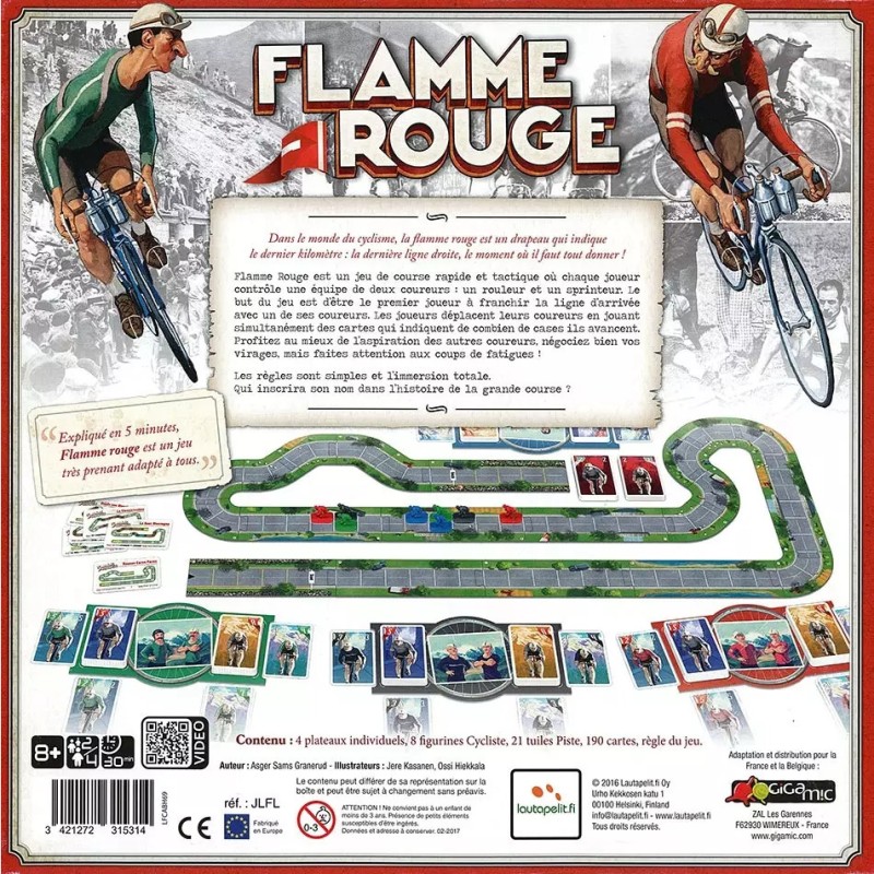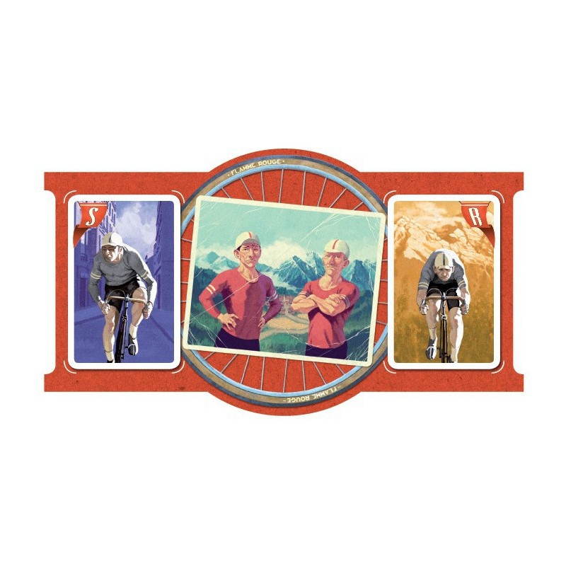 Flamme Rouge est un jeu de course rapide et tactique où chaque joueur contrôle une équipe de deux coureurs : un rouleur et un sprinteur. Le but du jeu est d'être le premier joueur à franchir la ligne d'arrivée avec un de ses coureurs. Les joueurs déplacent leurs coureurs en jouant simultanément des cartes qui indiquent le nombre de cases dont ils avancent. Profitez de l'aspiration des autres coureurs, négociez vos virages, mais attention aux coups de fatigues !