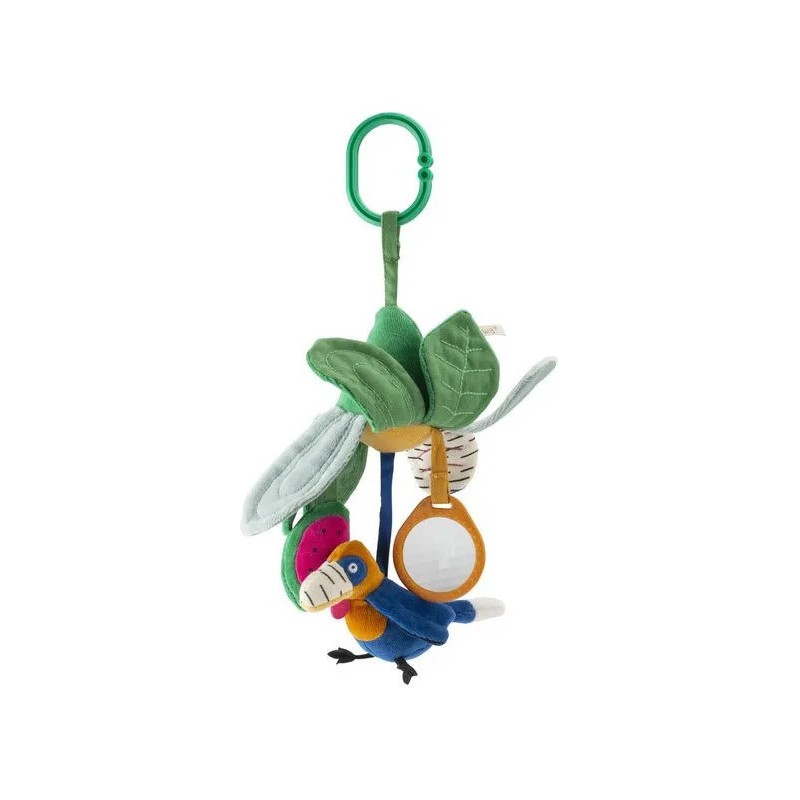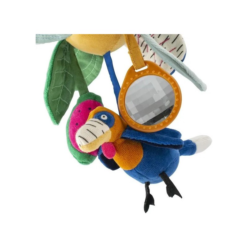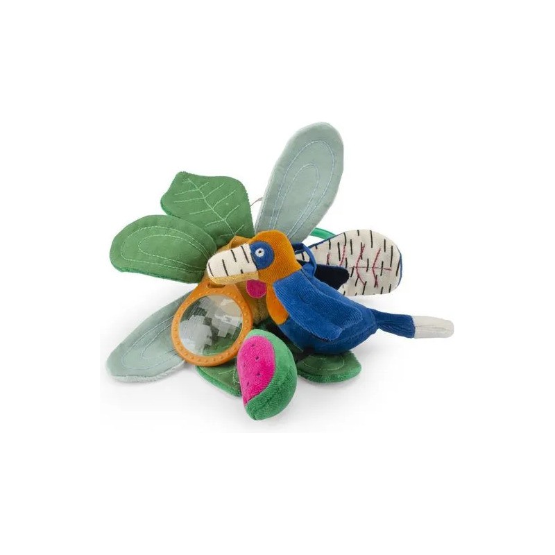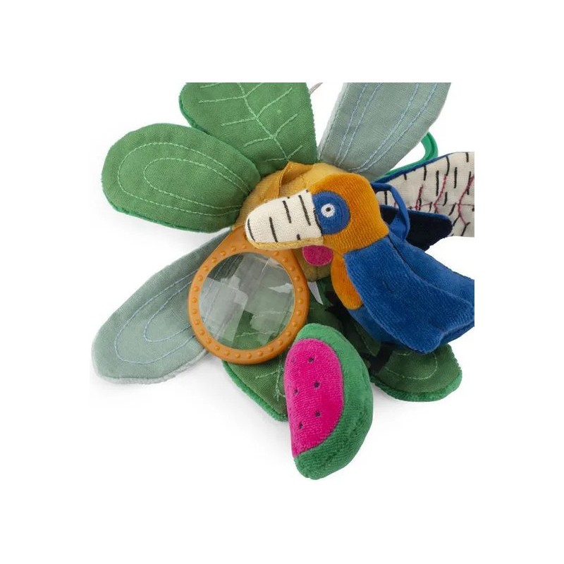 Fleur d'activités à suspendre avec différentes couleurs, motifs et textures. Bébé pourra faire greloter le calao et la pastèque, chiffonner les pétales qui font scritch et observer le monde à travers le prisme. En avant pour la découverte !