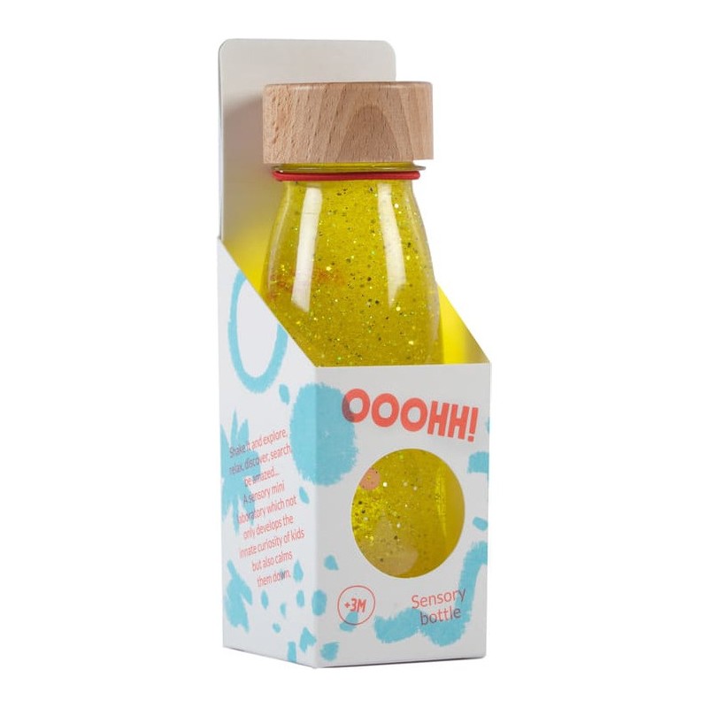 Découvrez la bouteille sensorielle Float jaune de la marque Petit Boum. Un jouet d’éveil coloré, inspiré de la pédagogie Montessori, qui stimule les sens des bébés dès 3 mois. Cette bouteille sensorielle fait partie de la gamme Float Bottle. Petit Boum a attrapé une à une les couleurs de l'arc-ciel pour créer ces flacons magiques.