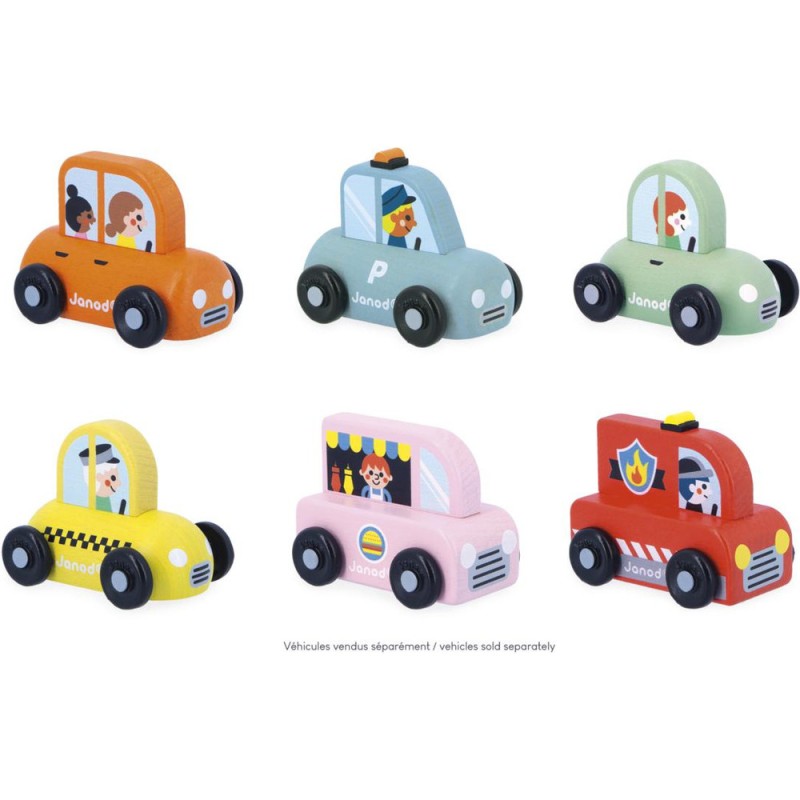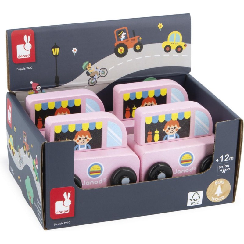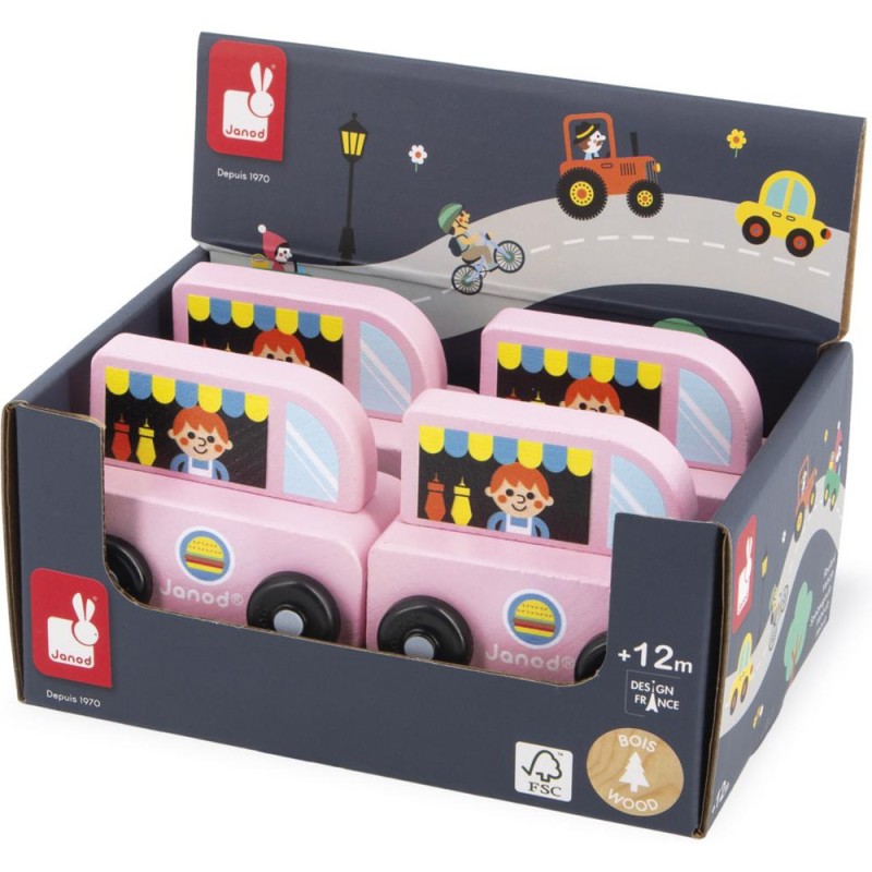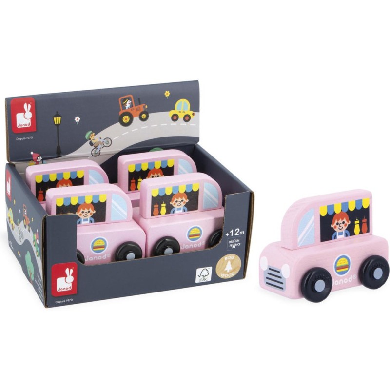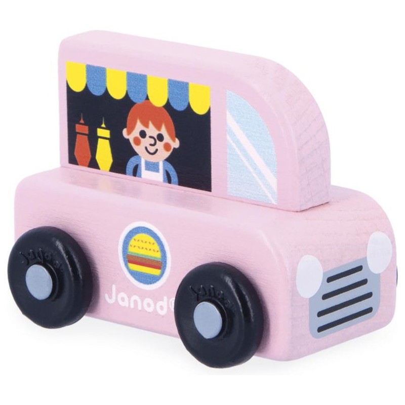 « Une petite faim peut-être ? » Cette petite voiture en bois convient aux enfants, dès l’âge de 12 mois. Dans son beau coloris rose, voilà un food-truck gourmand, prêt à servir des en-cas sucrés ou salés à toute heure de la journée ! Sa forme a été pensée spécialement pour une prise en main optimale pour les petits, qui peuvent facilement le tenir par le haut pour le faire rouler. Les véhicules sont parfaits pour inventer de nombreuses histoires et développer son imagination ! Les bébés s’amusent d’abord à les faire rouler, puis les plus grands se racontent toutes sortes d’aventures et développent leur vocabulaire et leur créativité. Cette petite voiture Janod est issue de notre collection Cross Roads : une série de tapis de jeu avec circuits, encore plus ludiques quand ils sont complétés par nos sets de cubes et nos petits véhicules en bois. Le food-truck convient particulièrement au tapis de jeu Ville, mais s’associe tout aussi bien avec d’autres tapis de la gamme. Il est composé de bois issu de forêts gérées durablement, certifié Fsc™. « Deux hamburgers, un donut et une glace : c’est parti ! »