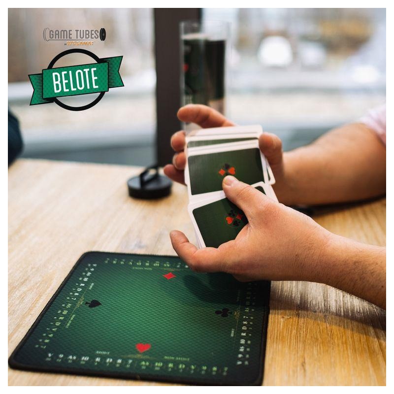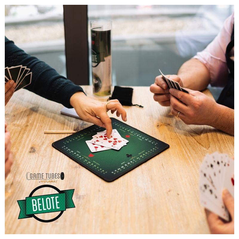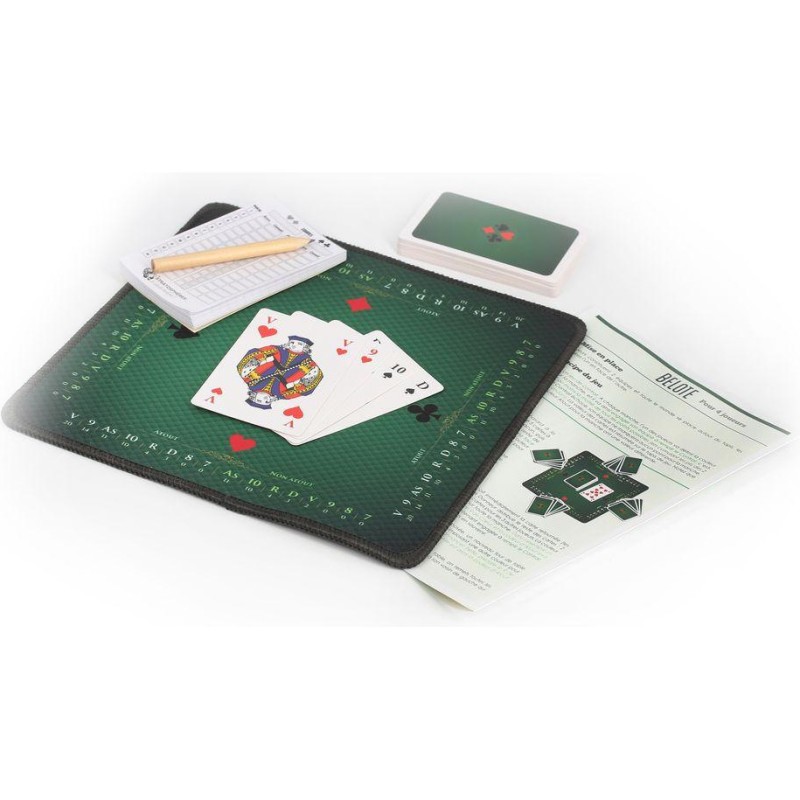 Le mini-tapis malin rappelle les valeurs des cartes, et le bloc-score permet d'être vraiment autonome pour lancer une partie de Belote n'importe où ! Avec une règle complète pour rappeler les bases de ce grand classique. Cartes de qualité.
