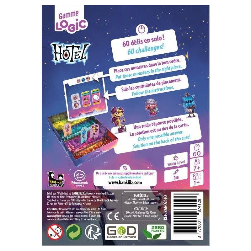 La gamme Bankiiiz Logic vous propose des défis intelligents et progressifs, dans des univers colorés aux réflexions variées. Dans Hotel, vous devrez mettre les clients d'un hôtel pour monstres au bon étage en fonction des désirs des clients monstrueux.