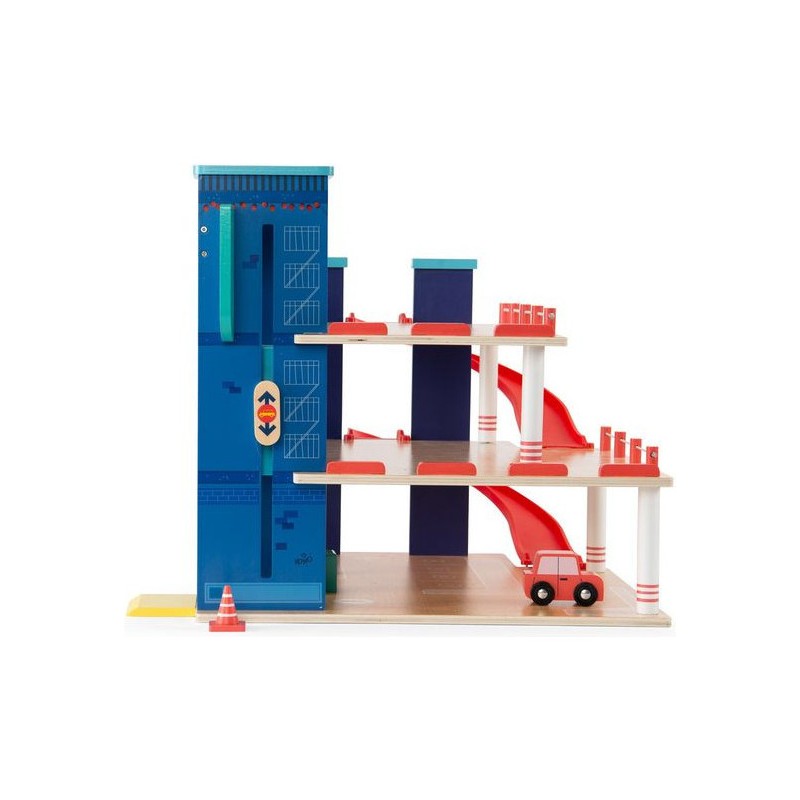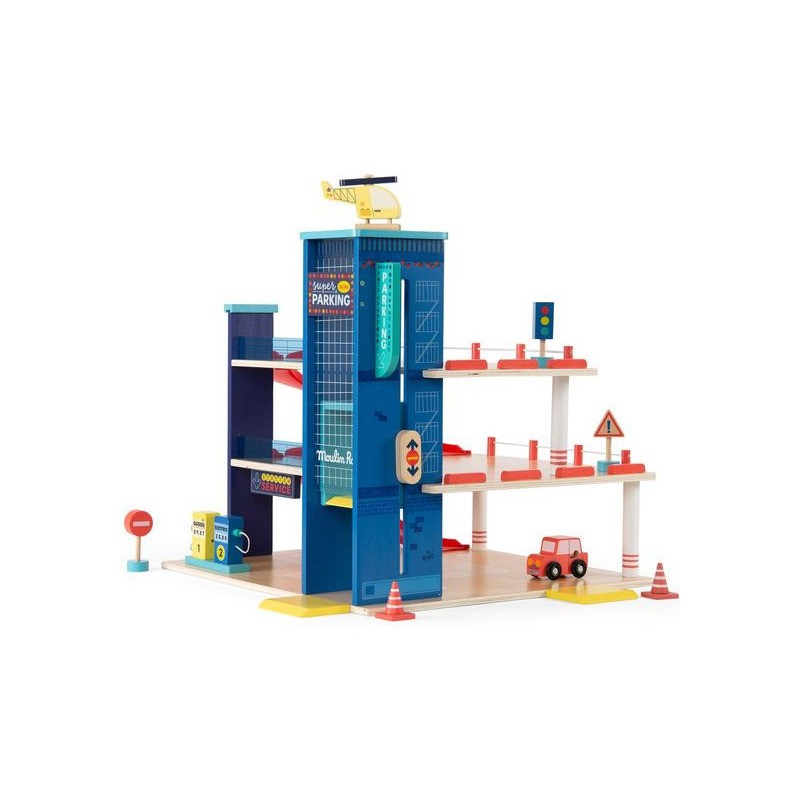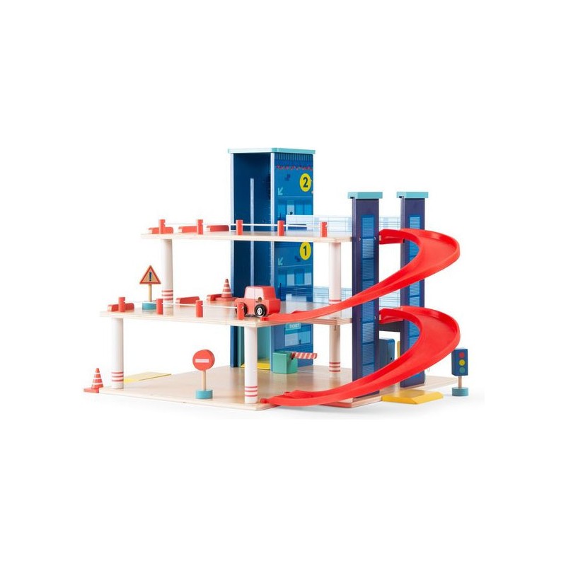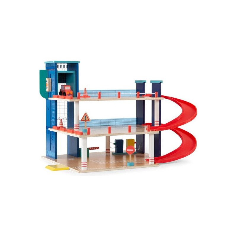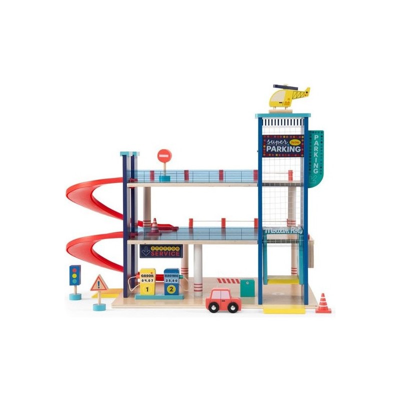 Garage en bois avec 3 niveaux et accessoires pour exploiter pleinement le parking, l'ascenseur mobile et la station-service. Aux commandes d'un hélicoptère ou au volant d'une voiture, les petits peuvent inventer des histoires incroyables. Contenu : Parking couvert, 2 x rampes, 1 x hélicoptère, 1 x voiture, 2 x panneaux routiers, 1 x feu tricolore, 2 x cônes de signalisation, station d'essence/chargement.