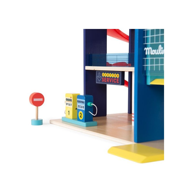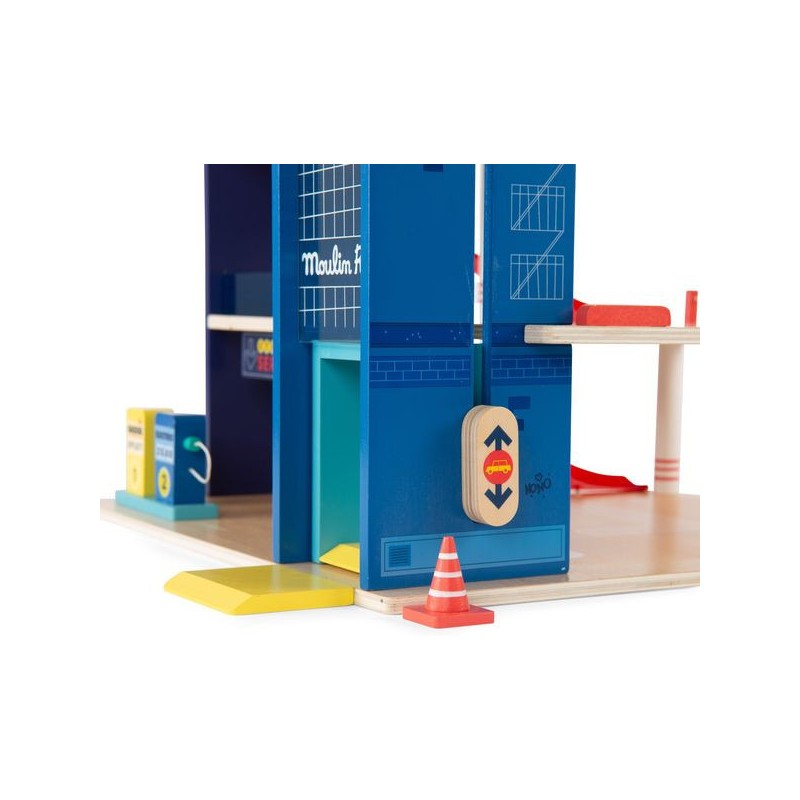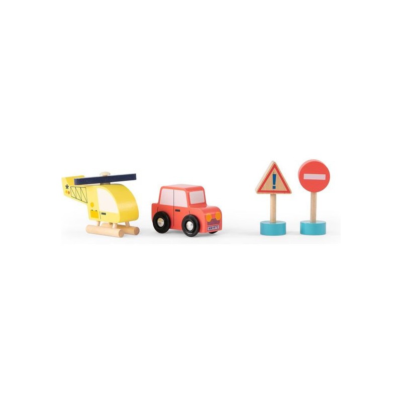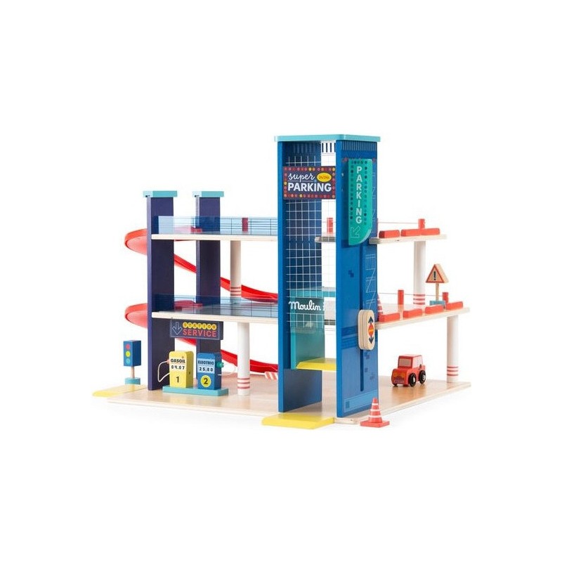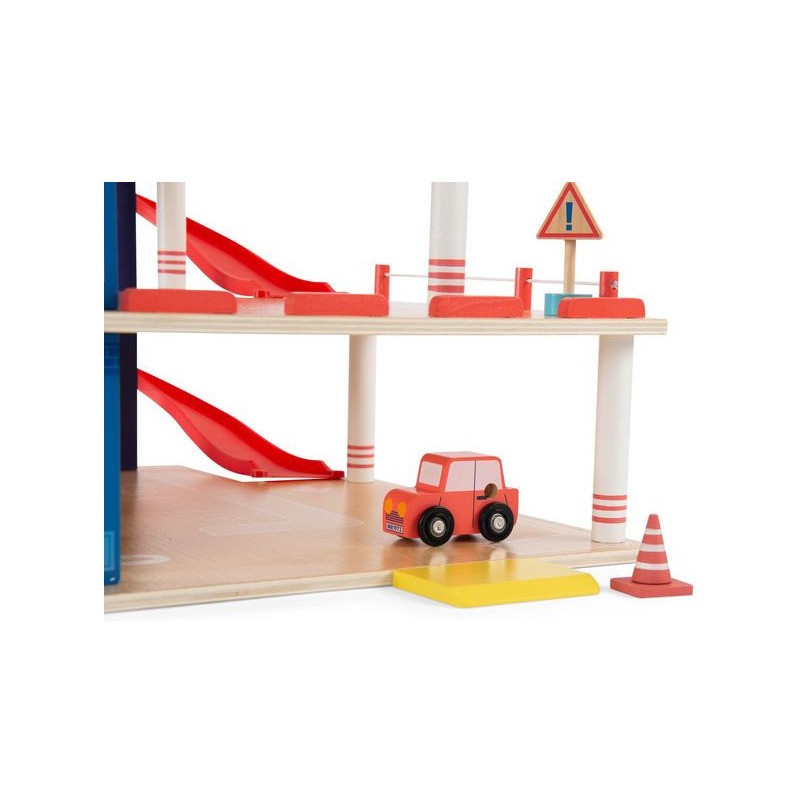 Garage en bois avec 3 niveaux et accessoires pour exploiter pleinement le parking, l'ascenseur mobile et la station-service. Aux commandes d'un hélicoptère ou au volant d'une voiture, les petits peuvent inventer des histoires incroyables. Contenu : Parking couvert, 2 x rampes, 1 x hélicoptère, 1 x voiture, 2 x panneaux routiers, 1 x feu tricolore, 2 x cônes de signalisation, station d'essence/chargement.