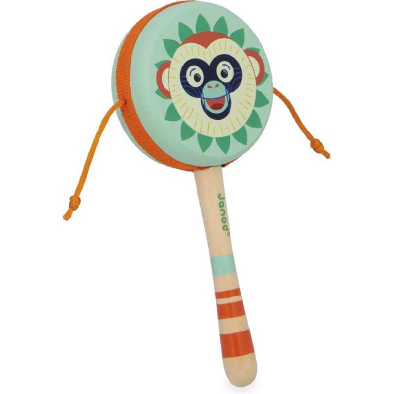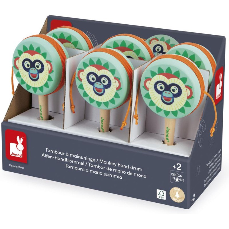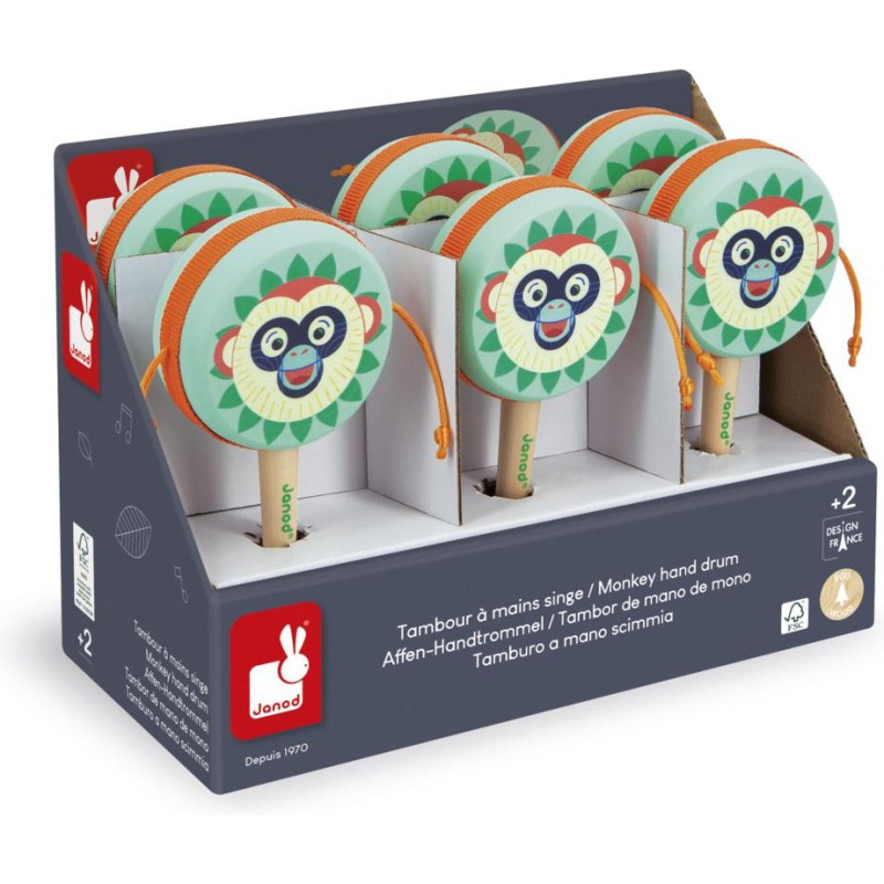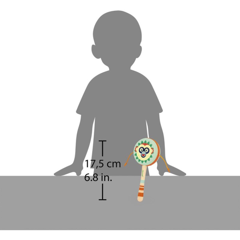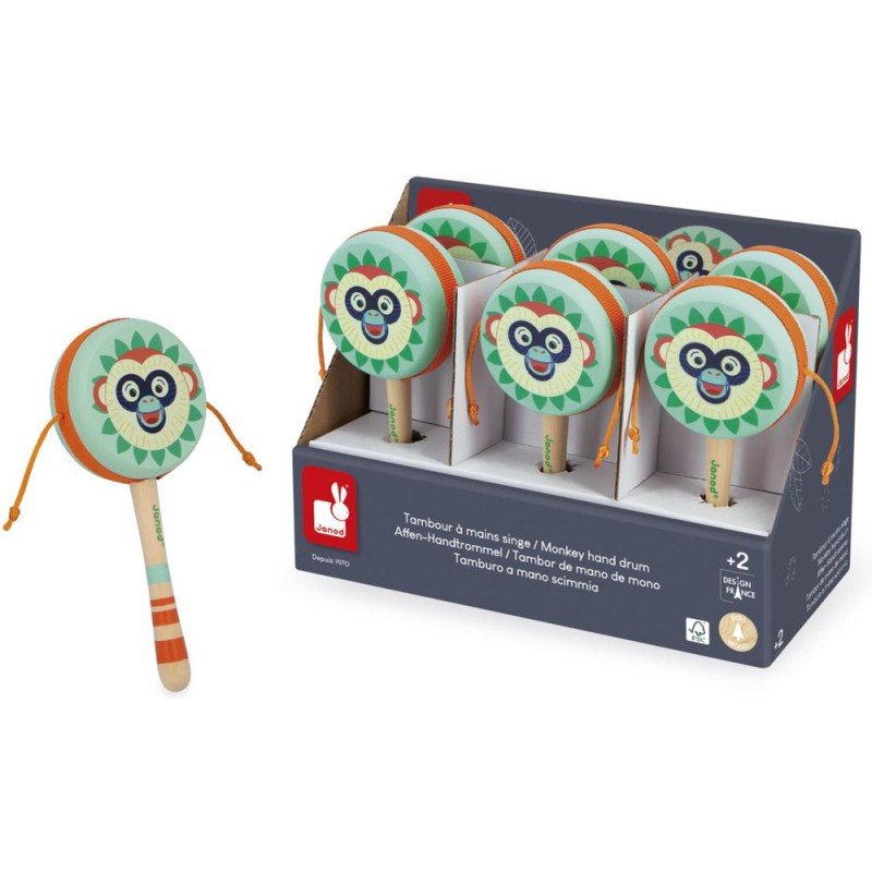 Soyez le maître des percussions ! Ce tambour à mains convient aux enfants à partir de 2 ans. C’est super simple d’en jouer : placez le manche entre vos mains, et faites-le rouler d’avant en arrière. Adaptez la vitesse pour créer des sons lents, ou au contraire, plus rapides et rythmés. Idéal pour développer son goût pour la musique et ses talents de musicien, ce jouet musical arbore de jolies couleurs : celles de notre gamme Gioia. On craque tous pour cette bouille de singe farceur ! Avec leur tambour à mains en bois, les enfants imaginent leurs propres mélodies et imitent les plus grands avec leur instrument rien qu’à eux. Son format de 17,5 cm permet une bonne prise en main et son utilisation est super simple pour les petits. Toute la famille peut danser en rythme avec ce jouet d’imitation ! Il fait partie de notre gamme Gioia, une invitation à l’éveil musical dans la joie, permettant aux tout-petits de découvrir le monde des sons de manière ludique et sous le signe du partage. Tambour à mains composé de bois issu de forêts gérées durablement, certifié Fsc™.