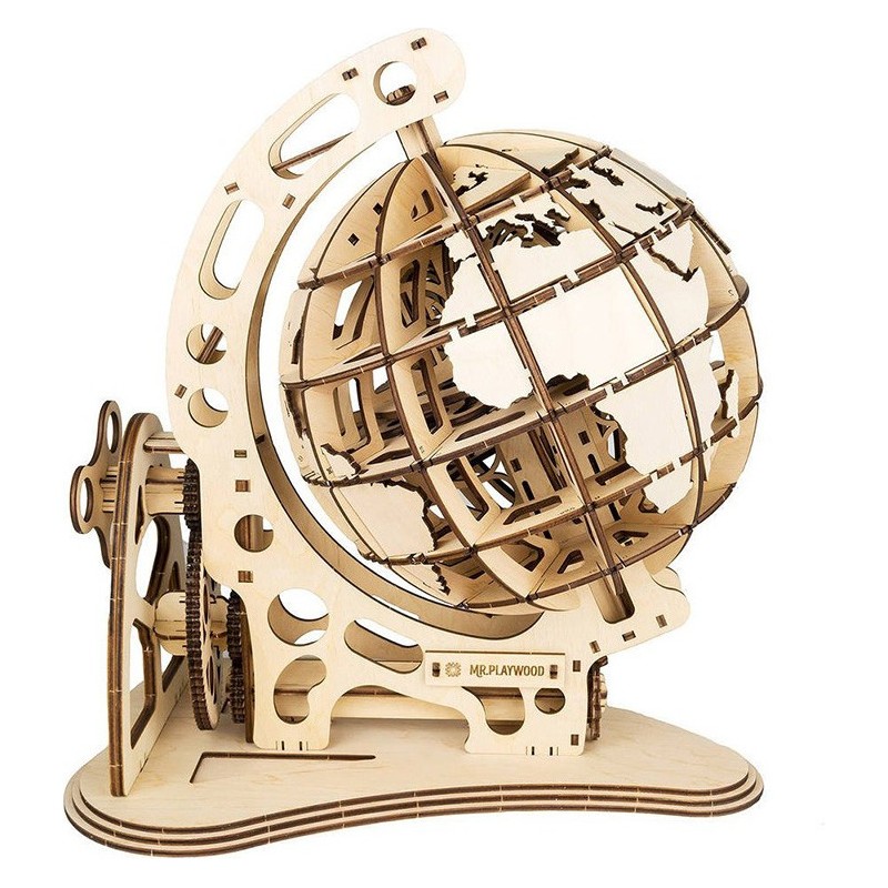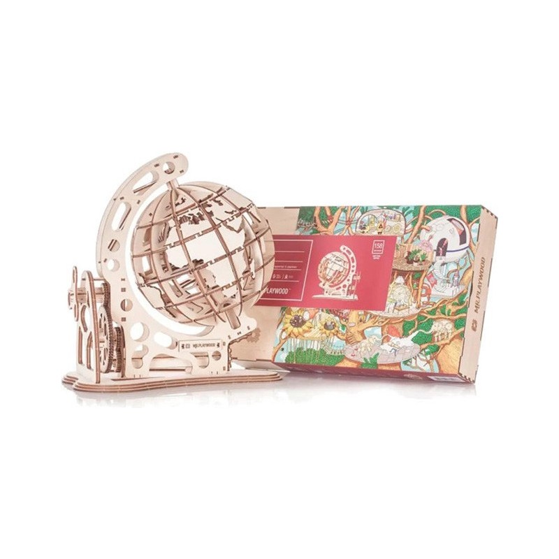 Le Globe de M. Playwood n'est pas seulement une boule sur laquelle sont dessinés des continents et qui est fixée à un support. C'est une véritable création, sans un seul clou ni colle, composée de 145 fines pièces de bois. Assemblez puis faites tourner le monde grâce à un système d'engrenages très élégant. Le modèle est disposé sur un support et est entraîné à l'aide d'un système complexe d'engrenages. En assemblant le modèle, vous pourrez étudier les continents et les pays de notre planète.