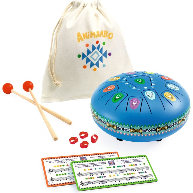 Contenu : 1 tambour en acier de 20 cm de diamètre avec 11 languettes, 4 pics à doigts, 1 sac de rangement et 2 partitions recto verso en carton épais (18 x 8.5 x 0.2 cm).