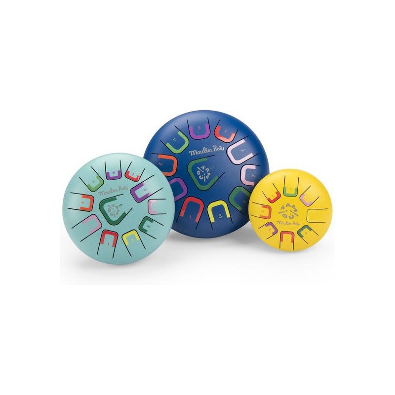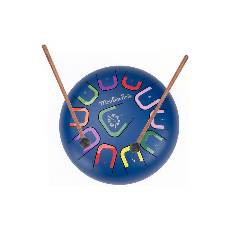 D'un diamètre de 24 cm et comprenant 11 notes, le tambour à languettes initient les enfants à la musique. Avec les doigts, la main ou les baguettes incluses, tout est bon pour danser avec Puce & Pilou. Contient un livret de partitions et un sac en tissu.