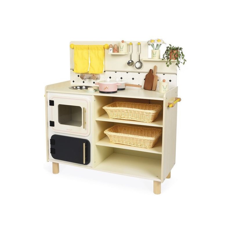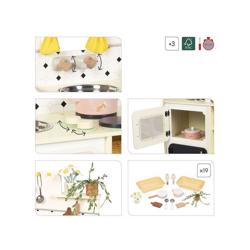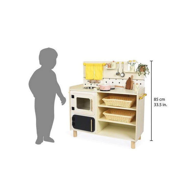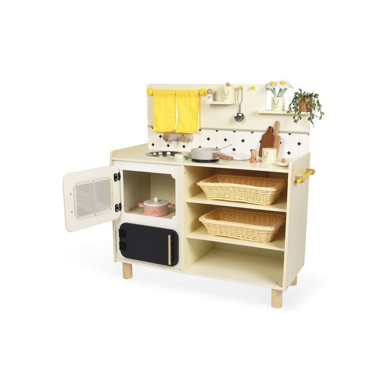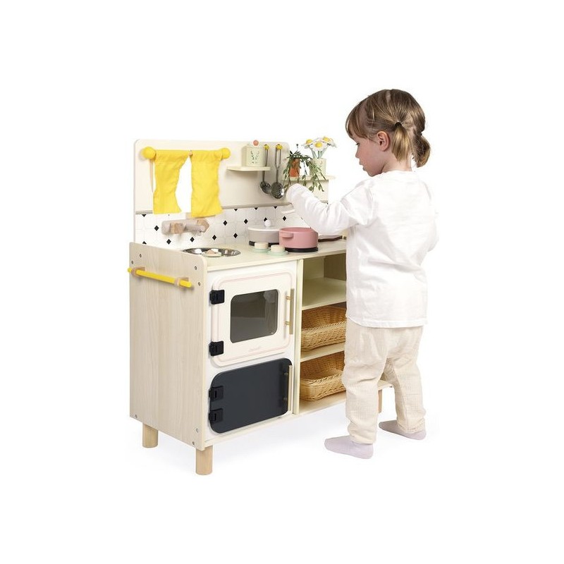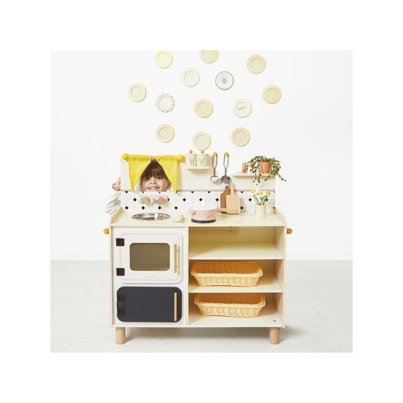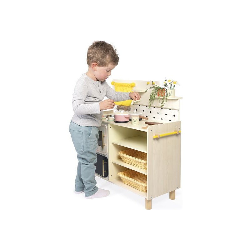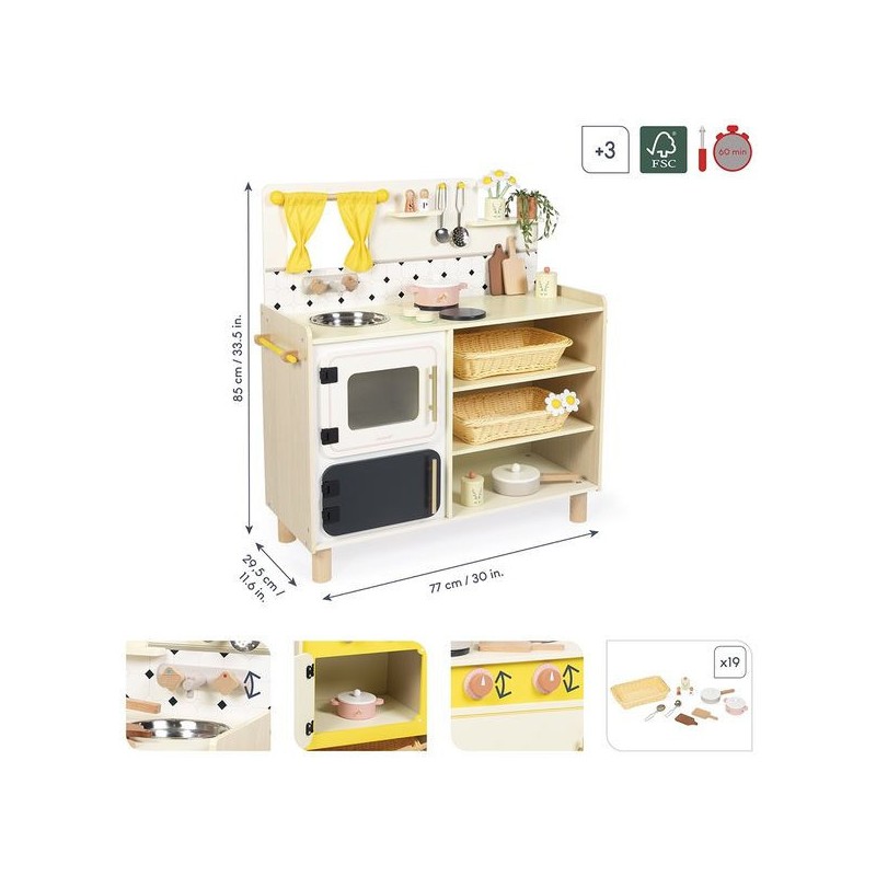 Les invités arrivent, vite, tous en cuisine ! Avec leur grande cuisine en bois, les enfants imaginent de délicieuses recettes aux fourneaux et imitent les plus grands, à partir de 3 ans. Équipée comme une vraie et avec 16 accessoires, cette cuisine jouet est parfaite pour jouer à la dinette et inventer toute sorte d’histoires et de petits plats ! La taille de cette kitchenette a été pensée pour offrir une belle surface de jeu : elle mesure 77 x 29,5 x 77 cm. Son style est inspiré de la cuisine de grand-mère, avec tous les indémodables que l’on adore retrouver encore aujourd’hui : 2 planches à découper, 1 poêle, 1 casserole, 1 écumoire, 1 louche, 1 salière, 1 poivrière, 2 pots à épices, 2 grandes panières, des rideaux, 1 vase avec 1 bouquet de 5 fleurs, 1 plante verte. Avec tous leurs ustensiles, les enfants préparent les ingrédients, les font mijoter et les assaisonnent selon leurs goûts, le tout dans leur propre cuisine rien qu’à eux. Mais ce n’est pas tout ! La cuisinière est aussi équipée de 2 fours avec portes magnétiques (parfait pour faire griller de la viande et cuire un bon gâteau en même temps), d’un évier avec boutons rotatifs pour le robinet, de plaques de cuisson avec boutons rotatifs sonores, de deux porte-torchons et d’une fenêtre. Parfait pour rincer les légumes ou laver la vaisselle avec une jolie vue ! La richesse des détails et le grand format de cette cuisine en bois sont un vrai coup de cœur ! Un autre de ses atouts : les charnières inédites des fours, anti-casse et pensées pour un assemblage facile. Il ne reste plus qu’à se mettre aux fourneaux pour faire un gratin de pommes de terre gourmand ou une bonne tarte aux pommes ! Cette grande cuisine pour enfant est composée de bois issu de forêts gérées durablement, certifié Fsc™. Elle fait partie de notre collection Mamie Soleil : un ensemble de jouets d’imitation inspirés de la cuisine de grand-mère, imprégnés d’émotions et de souvenirs d’enfance.