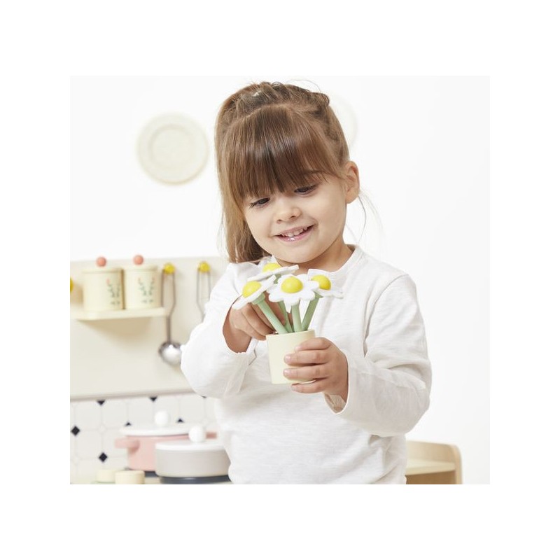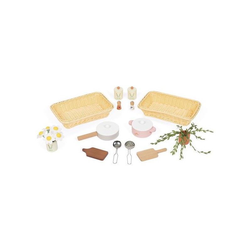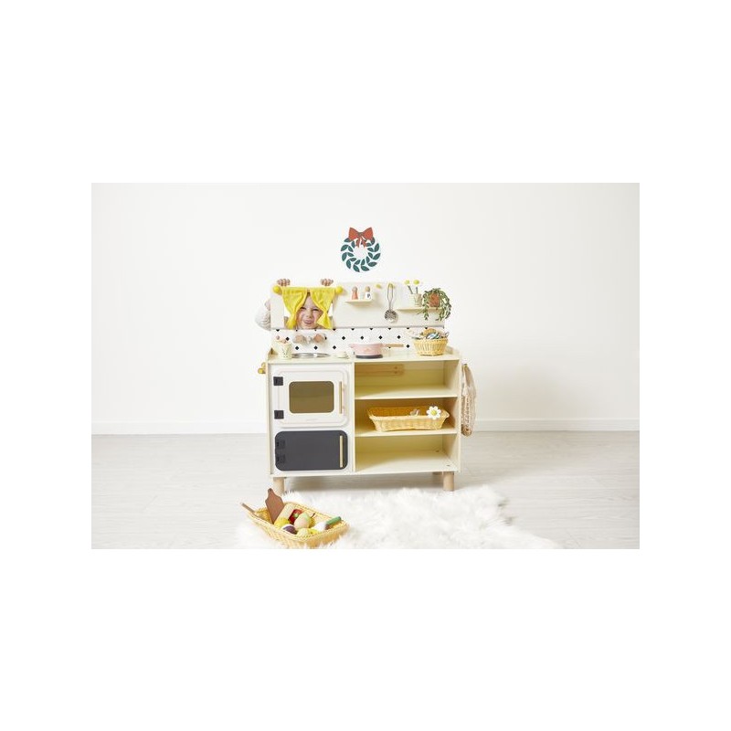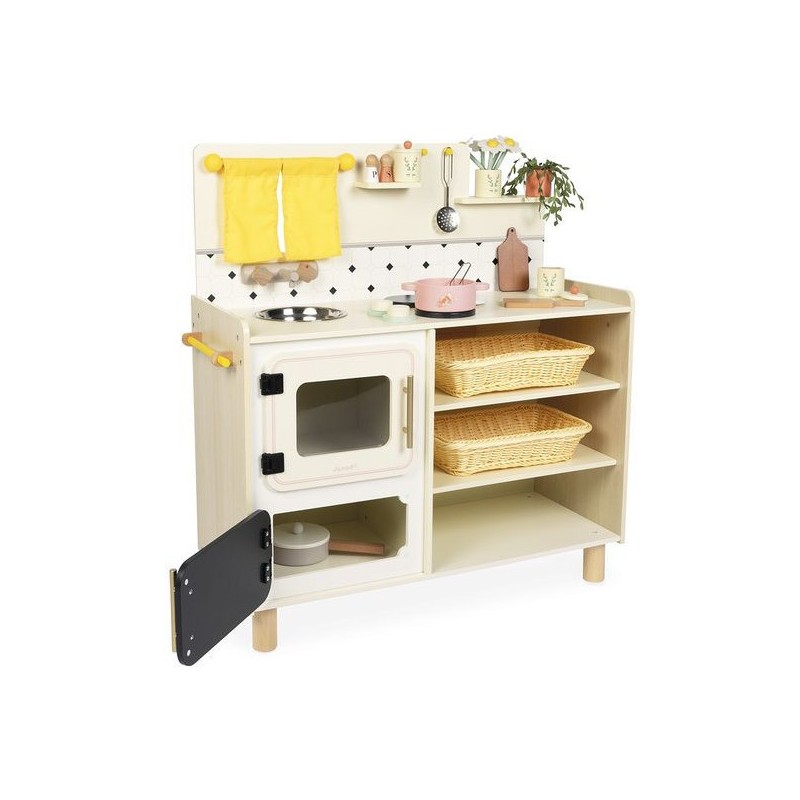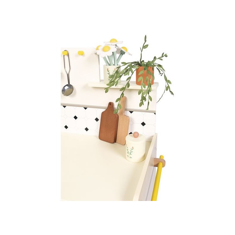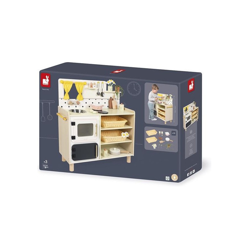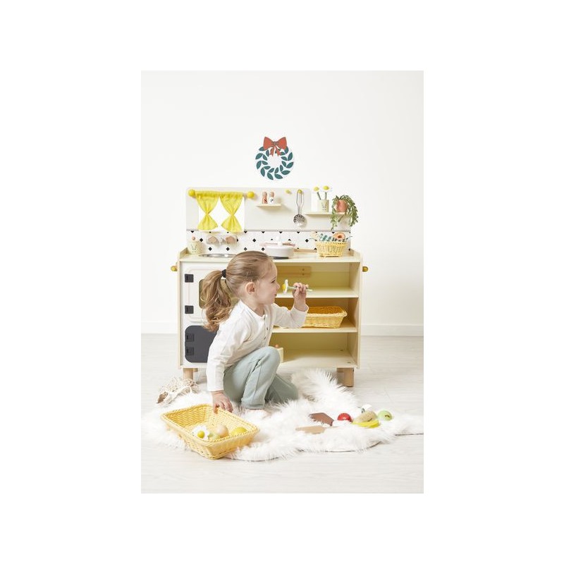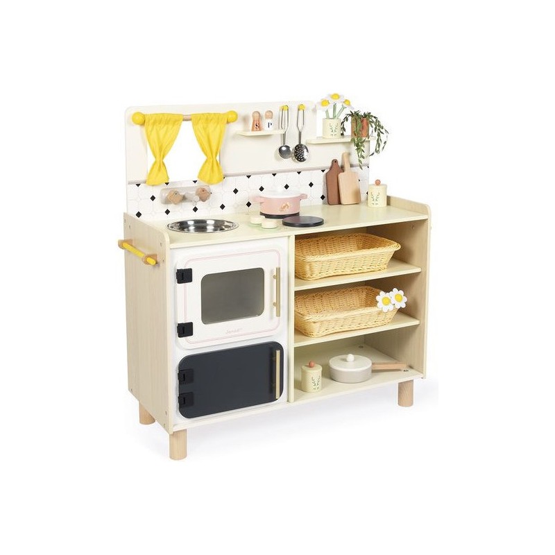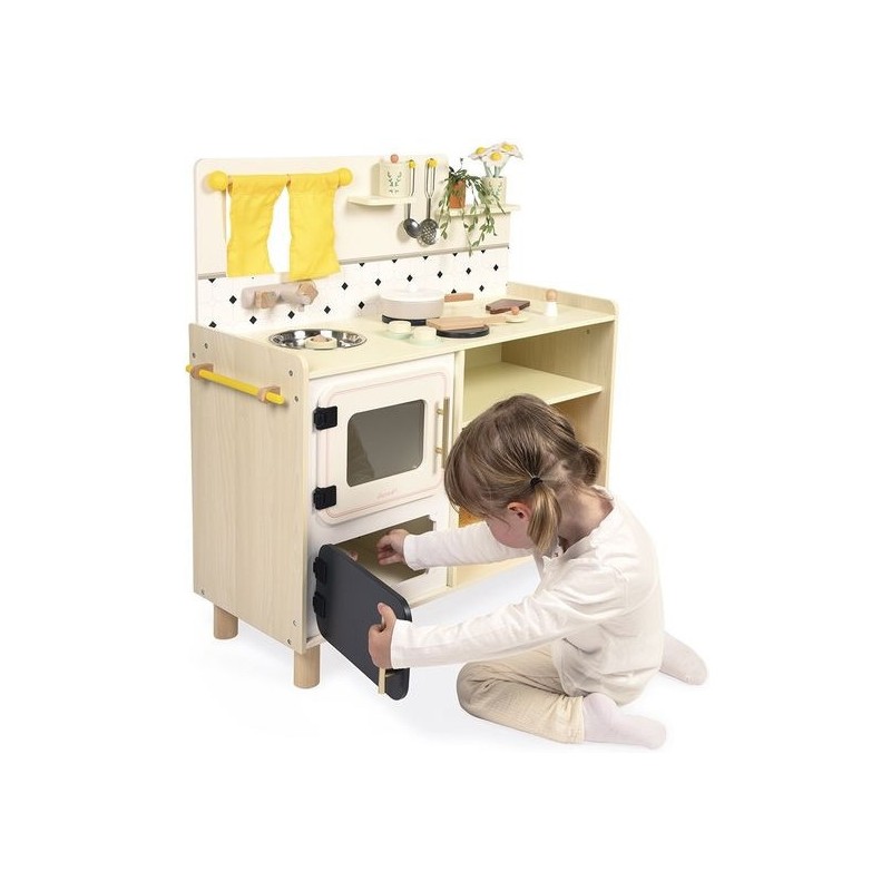 Les invités arrivent, vite, tous en cuisine ! Avec leur grande cuisine en bois, les enfants imaginent de délicieuses recettes aux fourneaux et imitent les plus grands, à partir de 3 ans. Équipée comme une vraie et avec 16 accessoires, cette cuisine jouet est parfaite pour jouer à la dinette et inventer toute sorte d’histoires et de petits plats ! La taille de cette kitchenette a été pensée pour offrir une belle surface de jeu : elle mesure 77 x 29,5 x 77 cm. Son style est inspiré de la cuisine de grand-mère, avec tous les indémodables que l’on adore retrouver encore aujourd’hui : 2 planches à découper, 1 poêle, 1 casserole, 1 écumoire, 1 louche, 1 salière, 1 poivrière, 2 pots à épices, 2 grandes panières, des rideaux, 1 vase avec 1 bouquet de 5 fleurs, 1 plante verte. Avec tous leurs ustensiles, les enfants préparent les ingrédients, les font mijoter et les assaisonnent selon leurs goûts, le tout dans leur propre cuisine rien qu’à eux. Mais ce n’est pas tout ! La cuisinière est aussi équipée de 2 fours avec portes magnétiques (parfait pour faire griller de la viande et cuire un bon gâteau en même temps), d’un évier avec boutons rotatifs pour le robinet, de plaques de cuisson avec boutons rotatifs sonores, de deux porte-torchons et d’une fenêtre. Parfait pour rincer les légumes ou laver la vaisselle avec une jolie vue ! La richesse des détails et le grand format de cette cuisine en bois sont un vrai coup de cœur ! Un autre de ses atouts : les charnières inédites des fours, anti-casse et pensées pour un assemblage facile. Il ne reste plus qu’à se mettre aux fourneaux pour faire un gratin de pommes de terre gourmand ou une bonne tarte aux pommes ! Cette grande cuisine pour enfant est composée de bois issu de forêts gérées durablement, certifié Fsc™. Elle fait partie de notre collection Mamie Soleil : un ensemble de jouets d’imitation inspirés de la cuisine de grand-mère, imprégnés d’émotions et de souvenirs d’enfance.