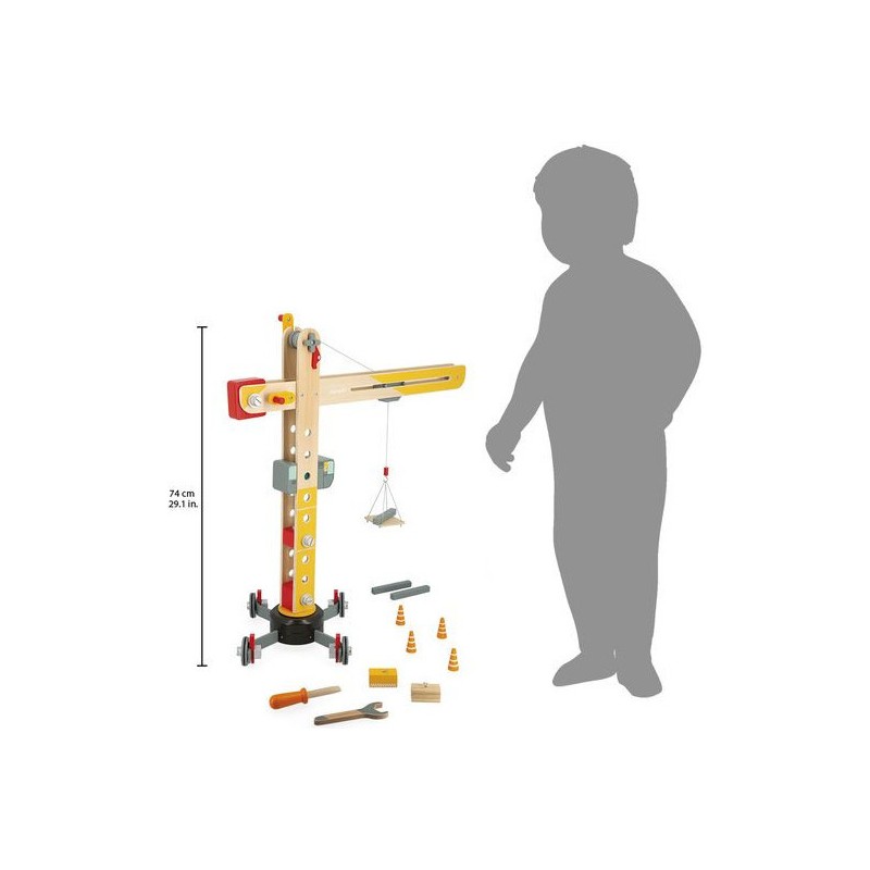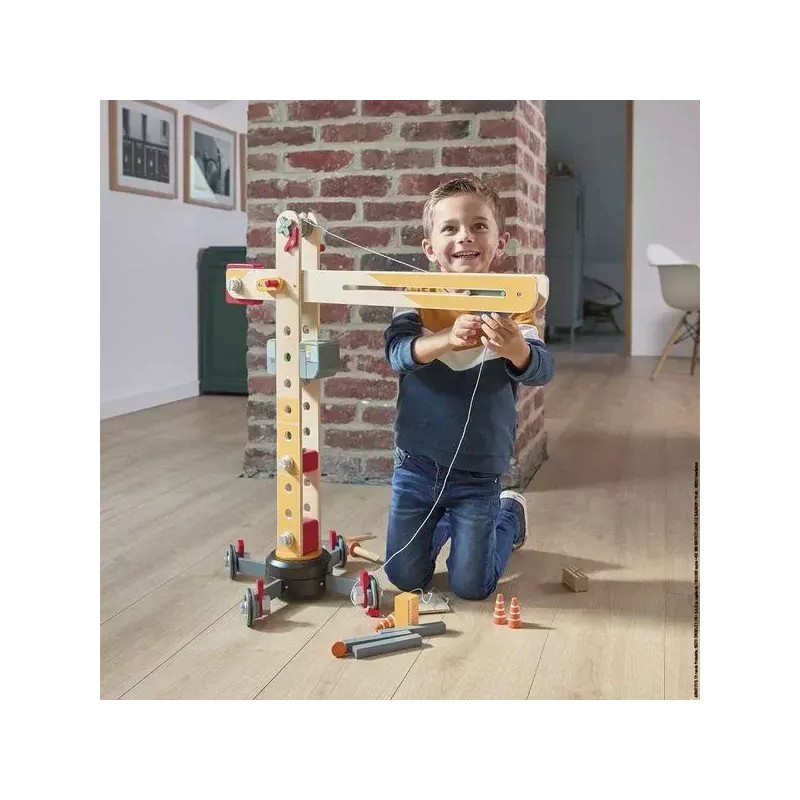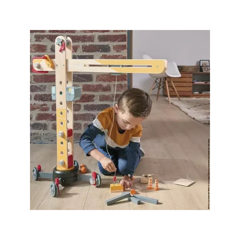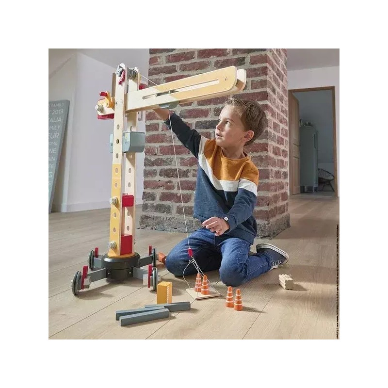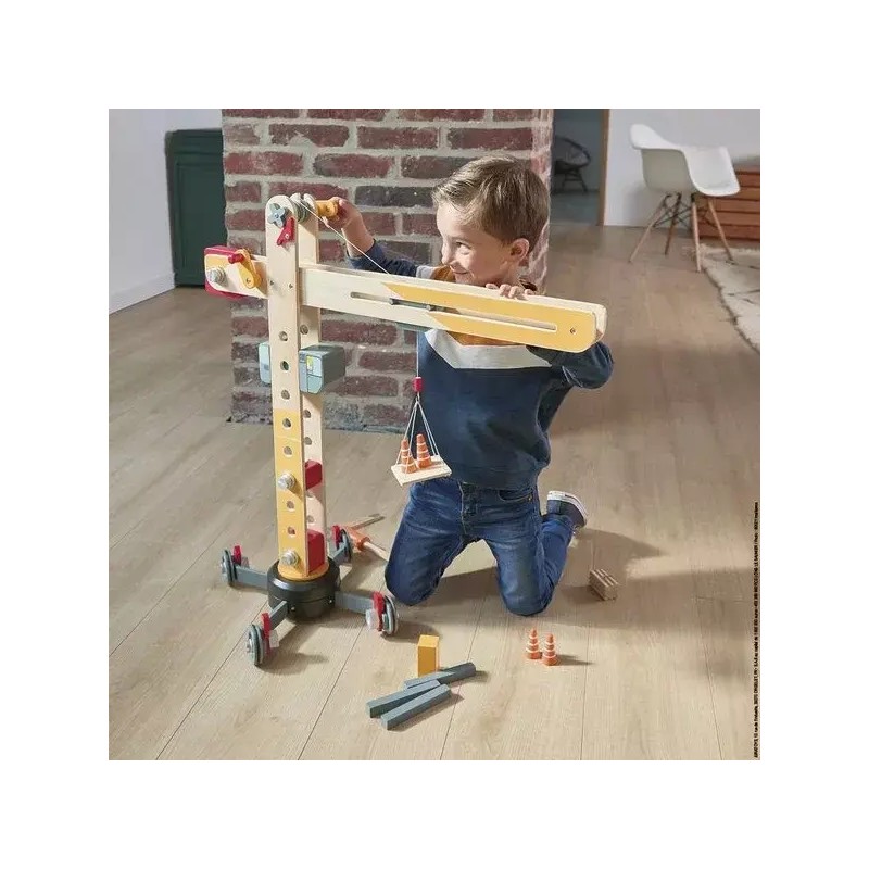 Avis aux amoureux des chantiers et des travaux en tout genre. Voici un jouet incontournable, une grue de construction en bois pour s'imaginer en chef de chantier expérimenté ! Ce grand jouet de 74 cm de haut sera la pièce centrale des histoires grandioses des enfants dès 3 ans. Quel plaisir de jouer avec cet engin de travaux publics robuste qui fera prendre de la hauteur à tous les apprentis constructeurs. D'abord, il faudra assembler ce beau jouet, un premier jeu de construction qui ravira les petits bâtisseurs. Cette grande grue mobile repose sur 4 roues qui permettent également de stabiliser l'ensemble. Un système de blocage empêche l'engin de bouger quand l'enfant le décide. L'élévateur se manipule très facilement grâce à 2 manivelles situées sur le dessus de la grue. Comme pour une vraie grue, elles permettent de faire monter et de diriger une nacelle qui transportera tout le lourd matériel nécessaire sur les chantiers ! Cette magnifique grue aux tons bois, oranges et rouges est équipée de 10 accessoires et de 2 outils. Elle est fabriquée à partir de bois Fsc (bois issus de forêt gérées durablement).