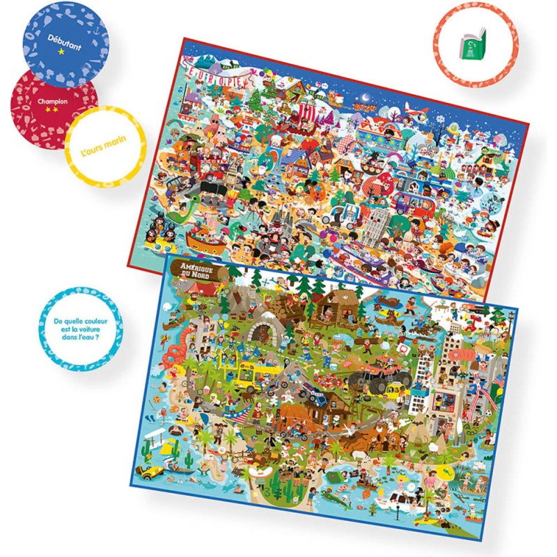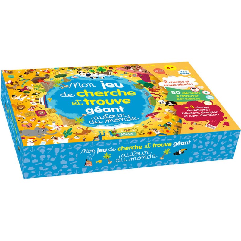 Un Cherche et Trouve Géant en jeu ! Dans ce jeu Cherche et Trouve Géant autour du monde, vous allez pouvoir jouer en équipe, ou en duel ! Retrouvez dans les deux plateaux, quatre-vingt éléments ! Ce jeu comprend 3 niveaux : - Niveau Débutant : Cherche et trouve à l'aide d'image, des objets ou des personnages. - Niveau Champion : Cherche et trouve, des objets ou des personnages avec leurs noms comme indice, vous devez les reconnaitre (exemple : Hansel et Gretel). - Niveau Super Champion : Vous devez répondre à des questions en cherchant la réponse dans les images. (exemple : De quel instrument joue-on sur le sous-marin jaune ? Mettez à l'épreuve votre rapidité et votre sens de l'observation dans ce jeu de cherche et trouve géant ! Age : Dès 4 ans Nombre de joueurs : 2-8 Durée : 30 minutes.