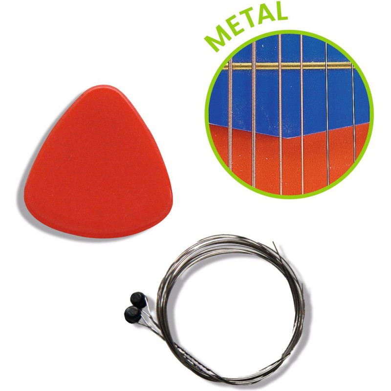 Contenu : 1 guitare (bois, métal et plastique)., 1 médiator, 2 cordes de rechange.
